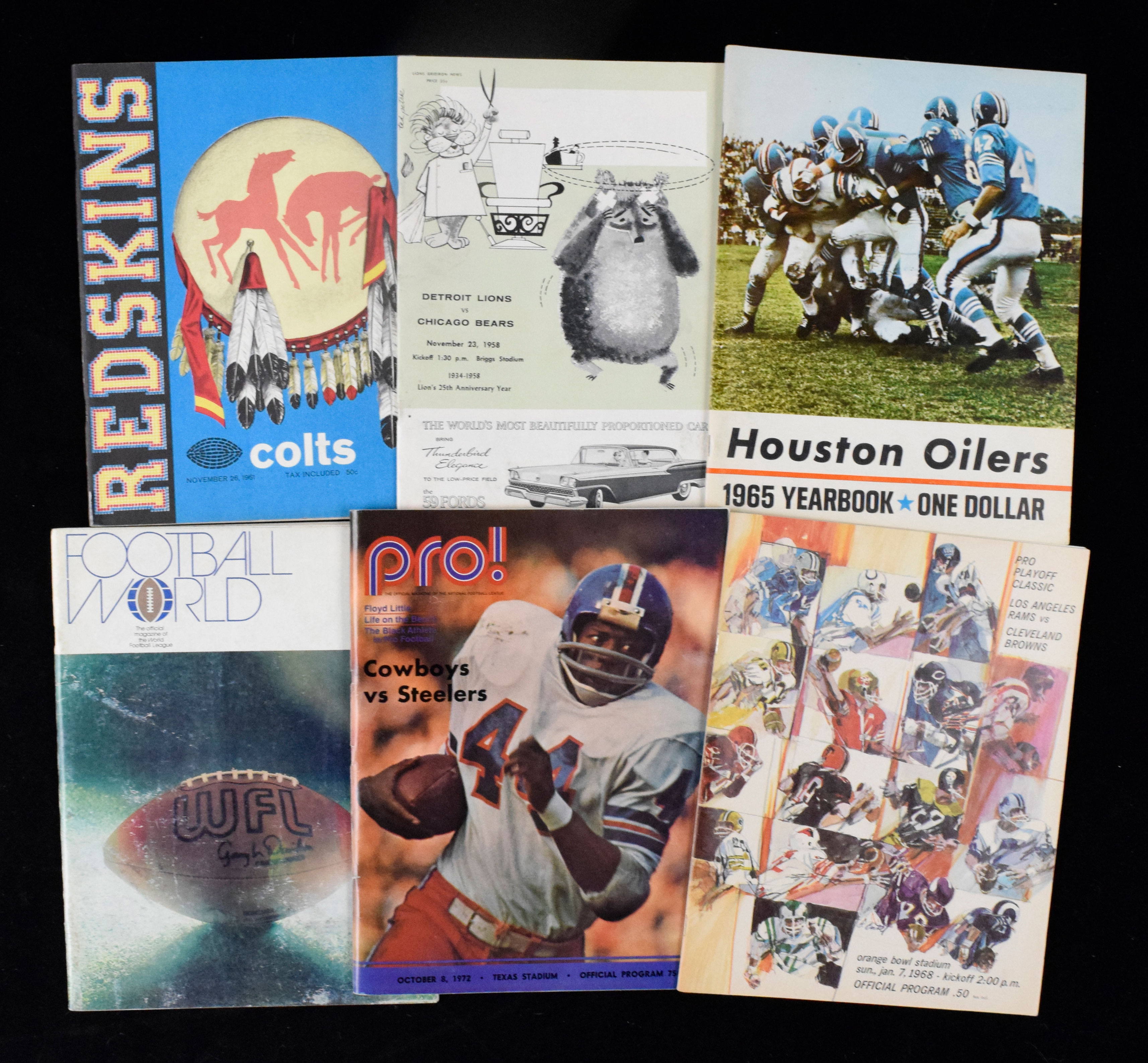 Description:Lot of (13) football programs and yearbooks from 1958-1996 (VG-NM). Programs include 11/23/1958 Chicago Bears at Detroit Lions, 11/26/1961 Baltimore Colts at Washington Redskins, 1/7/1968 Los Angeles Rams vs Cleveland Browns (Pro Playoff Classic), 10/8/1972 Pittsburgh Steelers at Dallas Cowboys, 9/18/1974 Memphis Southmen at Chicago Fire, and 1/14/1996 NFC Championship Game with ticket stub. Also includes (7) 1965 Houston Oilers yearbooks. Most appear to average EX overall with normal handling wear. Range: VG-NM
