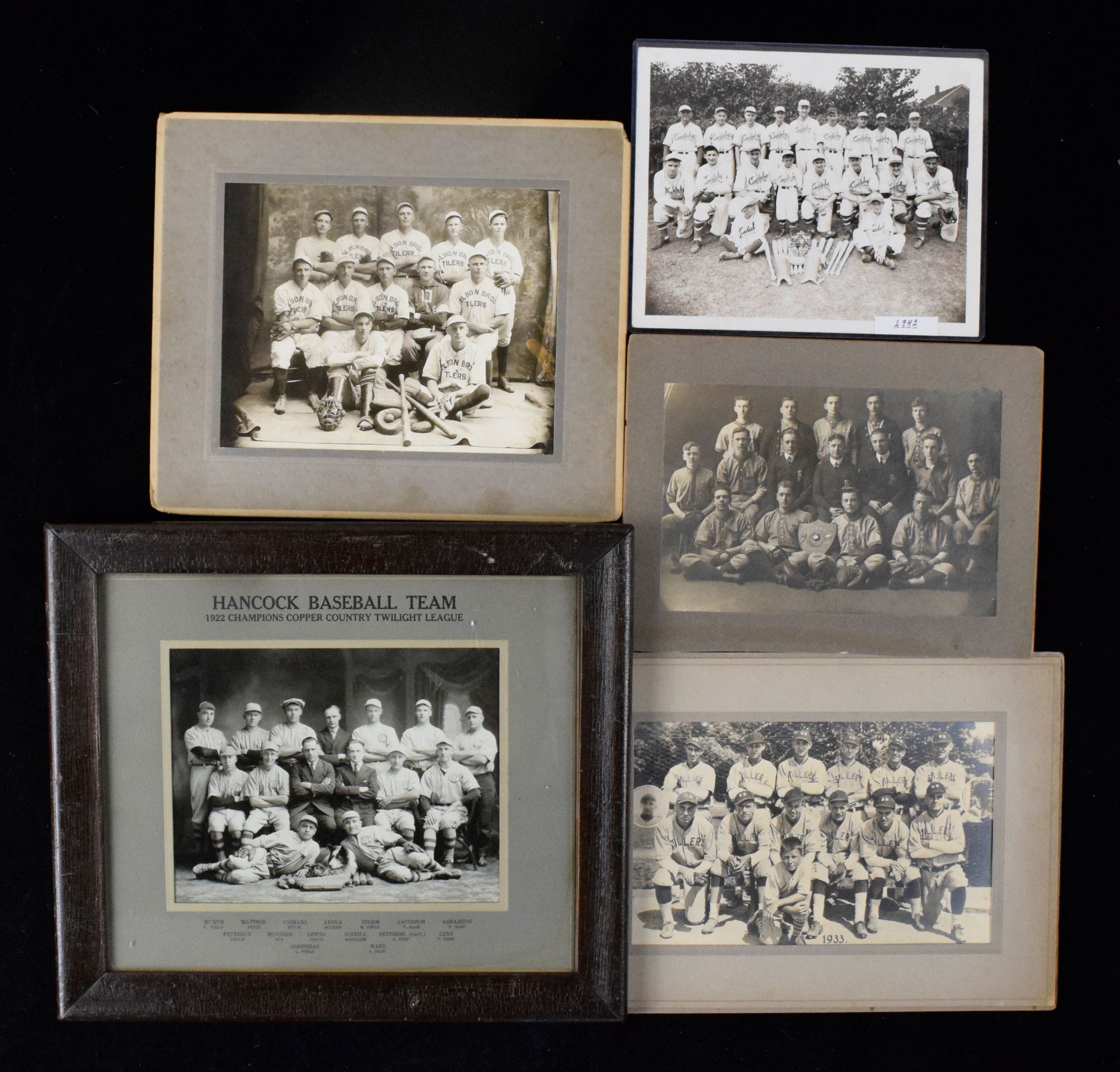 Description:Lot of (8) vintage baseball team photographs, c.1914-1942 (VG-NM). Includes 9"x12" mounted 1914 PK Manor CCSSA Normal Park League champons photo, 11.5"x13.5" matted c.early 1920s Olson Bros. Tilers team photo, 14.5"x16.5" framed Copper Country Twilight League champion 1922 Hancock Baseball Team photo, 8"x10" 1928 Marmons 1928 Kenosha Racine Inter City Champs team photo, 10.5"x12" matted 1931 Schuelke's Cigars team photo, 8"x10" c.1931 House Of David team photo, 10.5"x14.5" matted 1933 Stillers team photo, and 8"x10" c.1942 City Of Cudahy team photo. Most appear to average VG/EX-EX overall with normal age and handling wear. Range: VG-NM