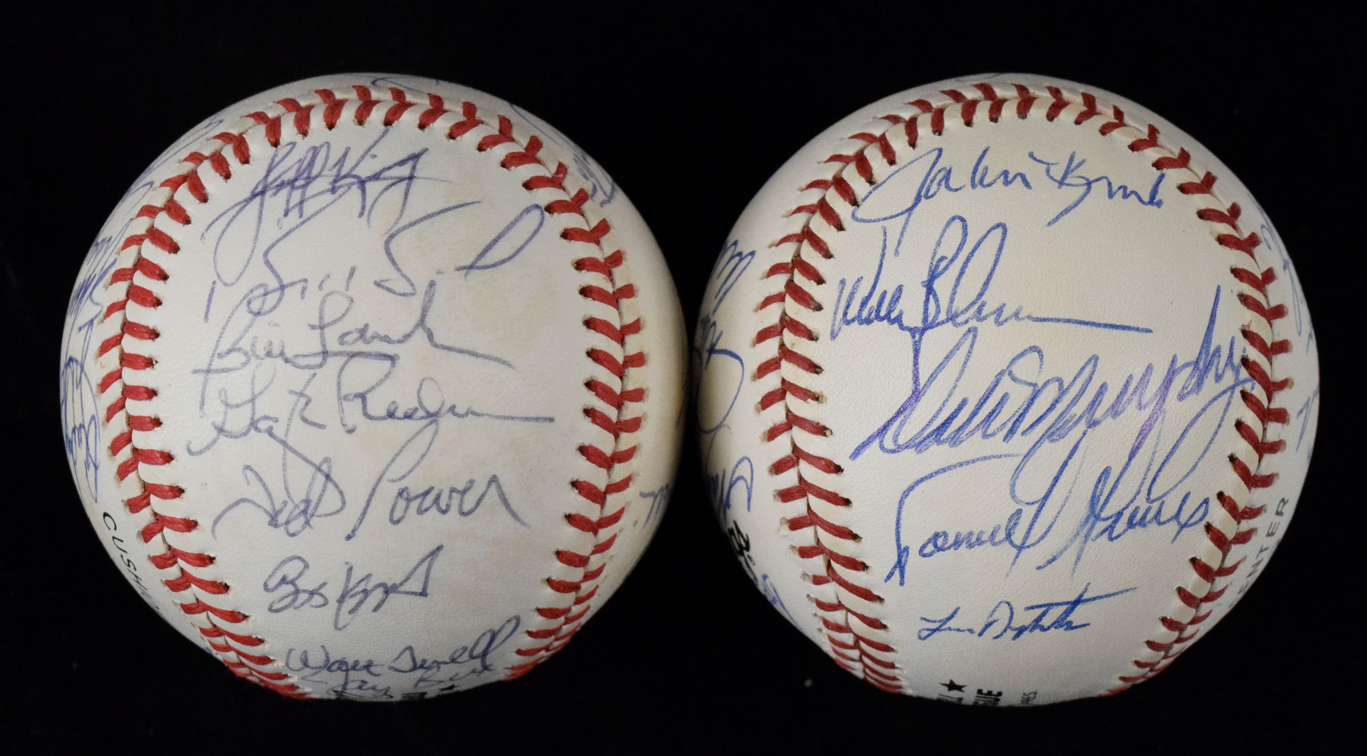 Description:1990 Pittsburgh Pirates and 1991 Philadelphia Phillies team signed baseballs (EX-NM). Includes W.White NL ball (toning) signed by (25) members of the 1990 National League East champion Pirates: Barry Bonds, Doug Drabek, Andy Van Slyke, Sid Bream, Jay Bell, Don Slaught, Mike LaValliere, Wally Backman, Gary Redus, Bob Patterson, Jose Lind, Jeff King, and others (Leyland is clubhouse signed); and W.White NL ball signed by (25) members of the 1991 Phillies: Jim Fregosi, Darren Daulton, John Kruk, Dale Murphy, Tommy Greene, Lenny Dykstra, Terry Mulholland, Dave Hollins, Mickey Morandini, Bruce Ruffin, Wally Ritchie, Dickie Thon, Charlie Hayes, Ricky Jordan, and others. Signatures rate 6/7 to 9/10 (avg 8) out of 10: EX-NM