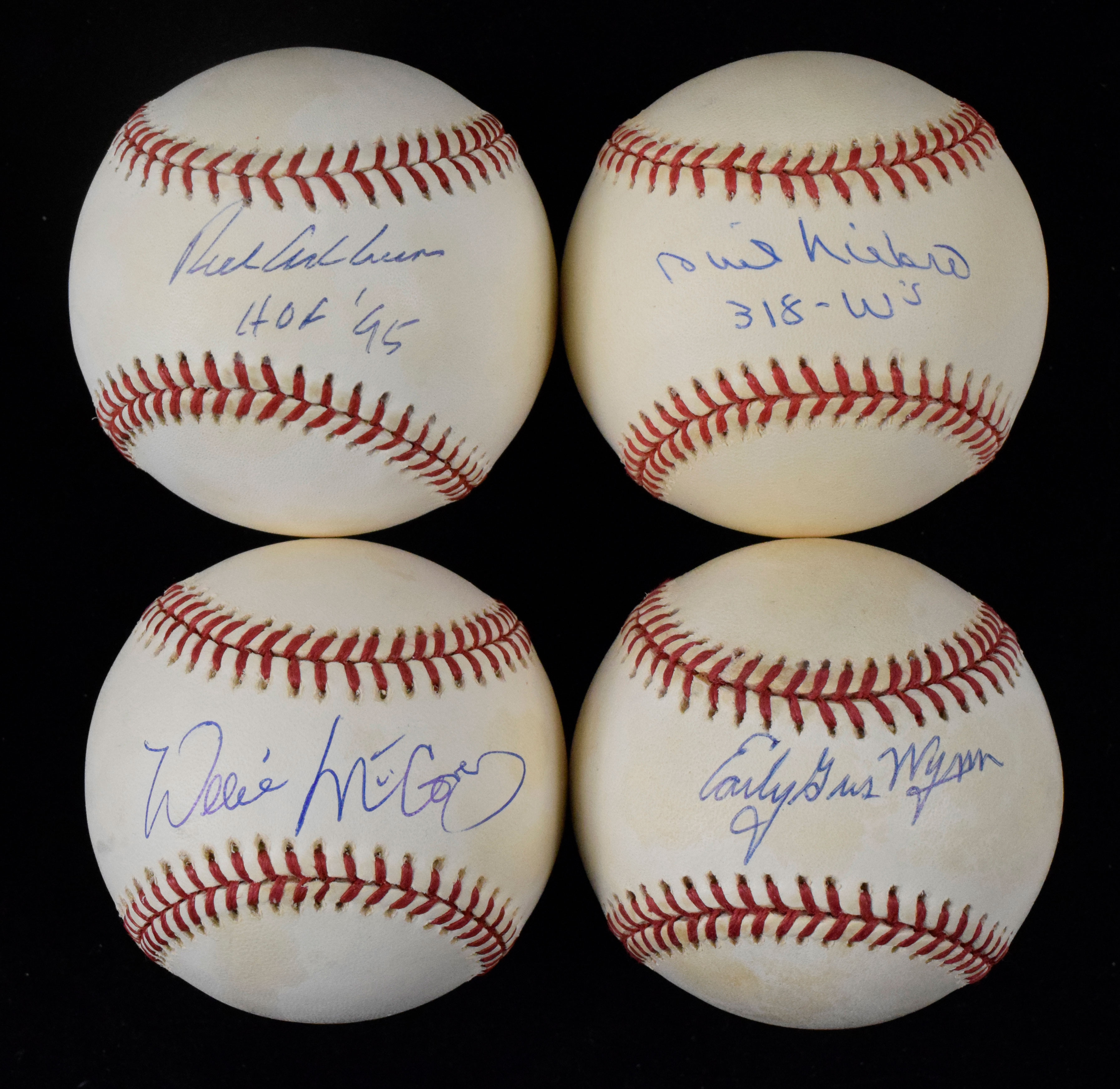 Description:Lot of (8) signed baseballs including HOFers (VG-EX/MT). Includes W.White NL ball signed by Richie Ashburn with "HOF 95" inscription, L.Coleman NL ball signed by Phil Niekro with "318 - W's" inscription, G.Budig AL ball signed by Early "Gus" Wynn, L.Coleman NL ball signed by Willie McCovey, B.Giamatti NL ball signed by Chris Short, B.Brown AL ball signed by Dom DiMaggio with "Li'l Professor" inscription, B.Brown AL ball signed by Clay Dalrymple, and L.Coleman NL ball dual-signed by Tony Gwynn and Chris Gwynn. Signatures rate 6 (Short) to 9/10 (avg 8) out of 10. Most balls appear to average EX overall due to various degrees of toning (Short most toned). Range: VG-EX/MT