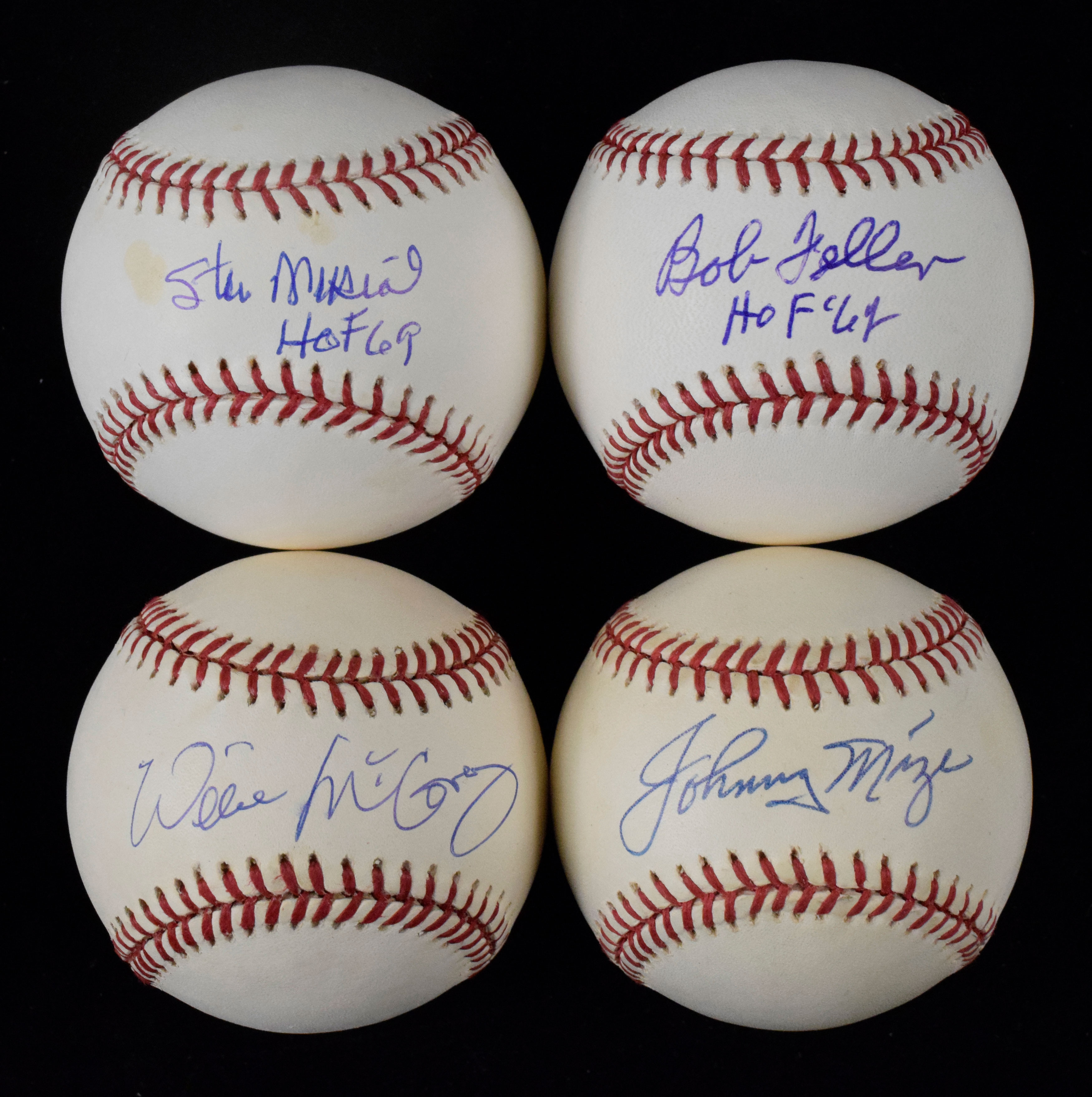 Description:Lot of (6) HOFers signed baseballs (VG-NM). Includes W.White NL ball (toned) full name signed by Don Richard Ashburn, B.Selig ML ball (toning) signed by Stan Musial with "HOF 69" inscription, B.Brown AL ball (toning) signed by Luke Appling, B.Brown AL ball (light toning) signed by Johnny Mize, L.Coleman NL ball (light toning) signed by Willie McCovey, and B.Selig ML ball signed by Bob Feller with "HOF 62" inscription (PSA/DNA). Signatures rate 7/8 to 9/10 out of 10: VG-NM