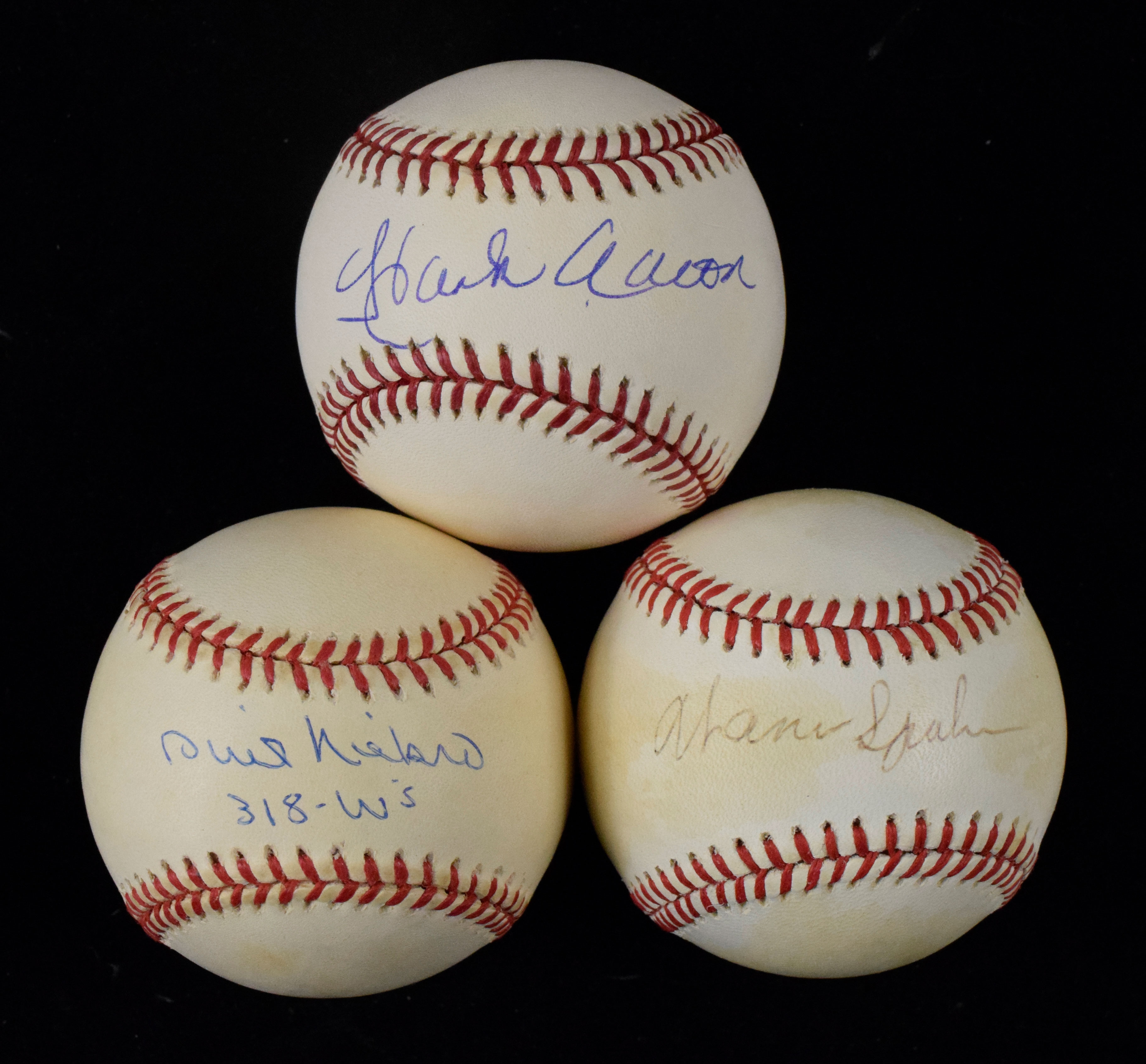 Description:Hank Aaron, Phil Niekro, and Warren Spahn signed baseballs (VG-EX/MT). Includes B.Giamatti NL ball (light toning) signed by Hank Aaron (Steiner), L.Coleman NL ball (toning) signed by Phil Niekro with "318 - W's" inscription, and C.Feeney NL ball (toned) signed by Warren Spahn. Signatures rate 6/7 (Spahn) to 9 out of 10: VG-EX/MT