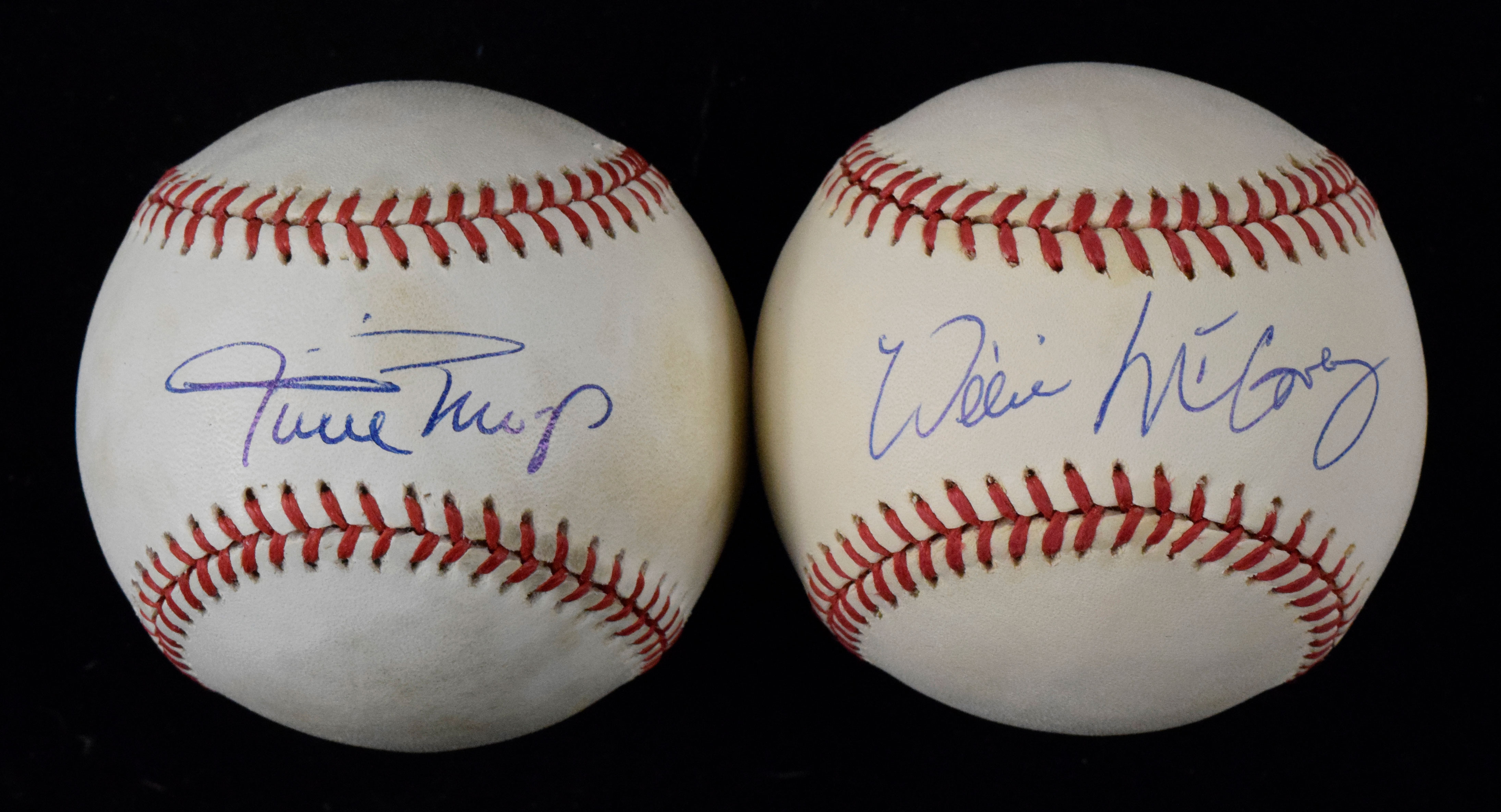 Description:Willie Mays and Willie McCovey signed baseballs (VG/EX-EX/MT). Includes B.Giamatti NL ball (toned) signed by Willie Mays, and L.Coleman NL ball (light toning) signed by Willie McCovey. Signatures rate 8/9 to 9 out of 10: VG/EX-EX/MT