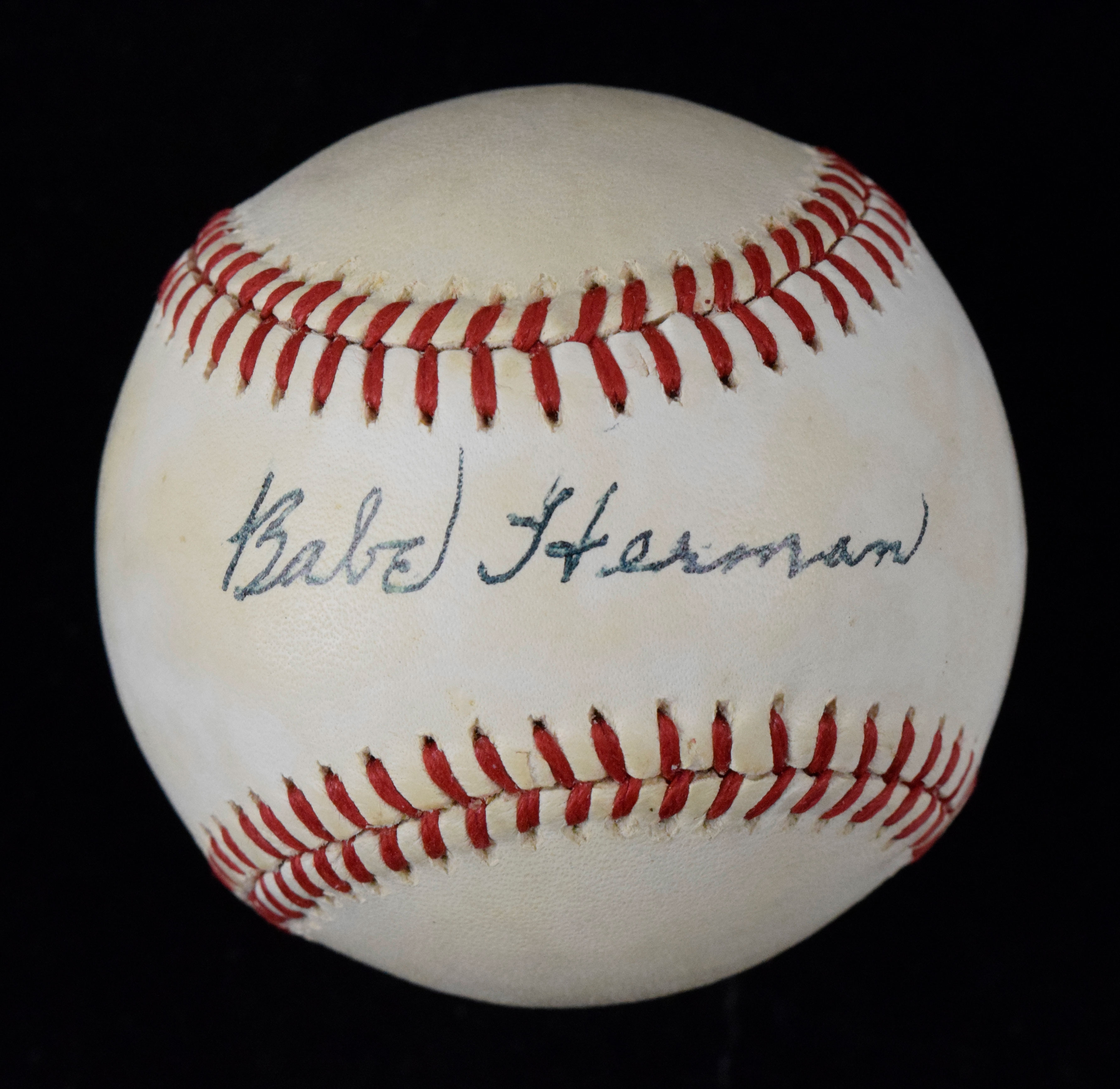 Description:Babe Herman signed C.Feeney NL baseball (EX). Herman signed the sweet spot in black ink. Signature rates 8 out of 10. Areas of light to moderate toning on each panel: EX