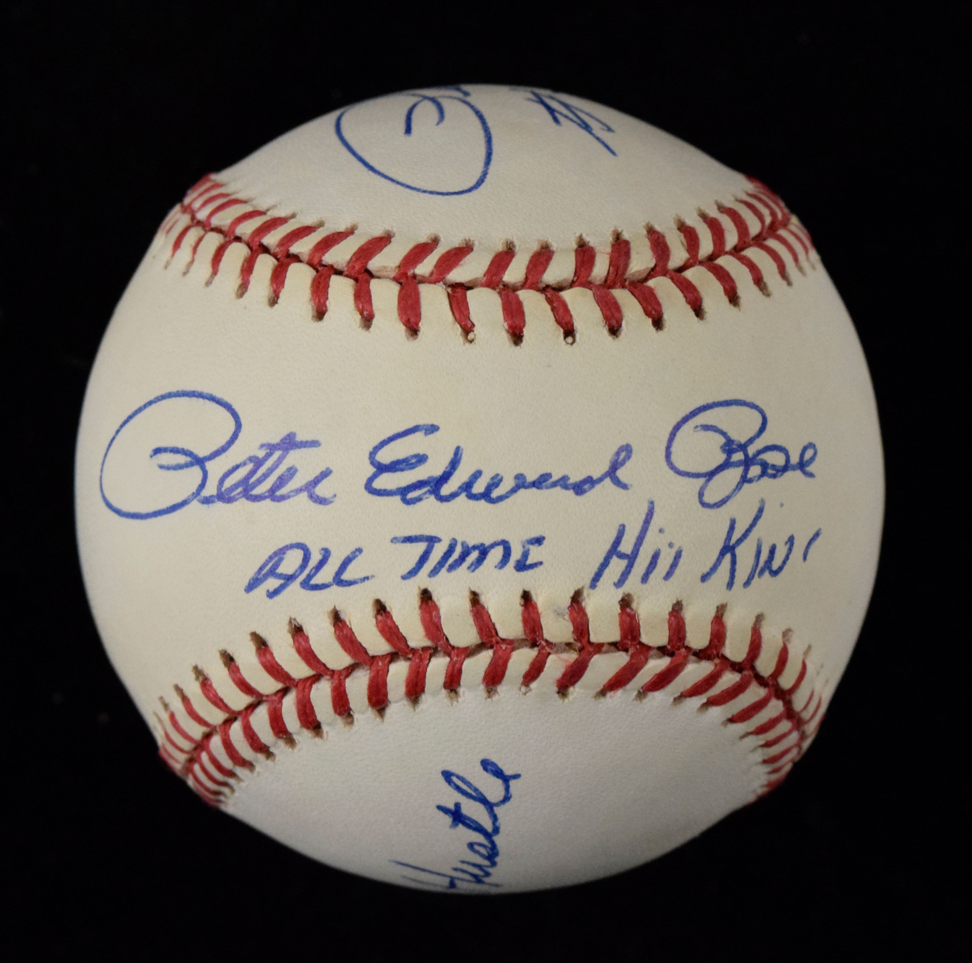 Description:Pete Rose twice-signed and multi-inscribed baseball (EX/MT). L.Coleman NL ball full name signed by Peter Edward Rose on the sweet spot with "All Time Hit King" inscription. Rose also signed the panel above and added "#4236" inscription, and added "Charlie Hustle" inscription on the panel below. Signatures rate 9 to 9/10 out of 10. Light, even toning: EX/MT