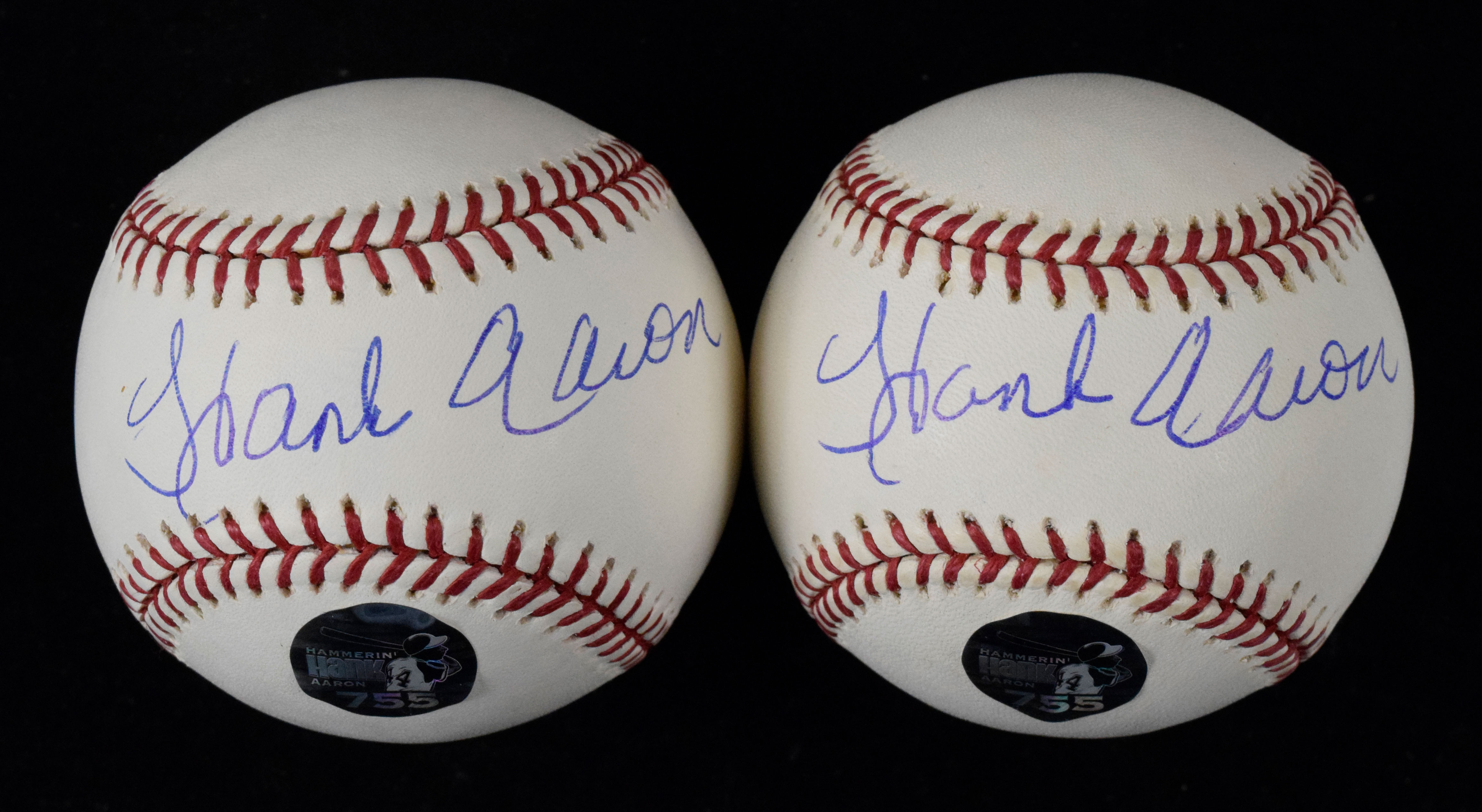 Description:Lot of (2) Hank Aaron signed baseballs - Steiner (NM-NM/MT). Includes (2) B.Selig ML balls both signed by Hank Aaron in blue ink. Signatures rate 9 to 9/10 out of 10. Both come with Steiner COA, and Steiner's Hank Aaron hologram sticker is on each ball: NM-NM/MT