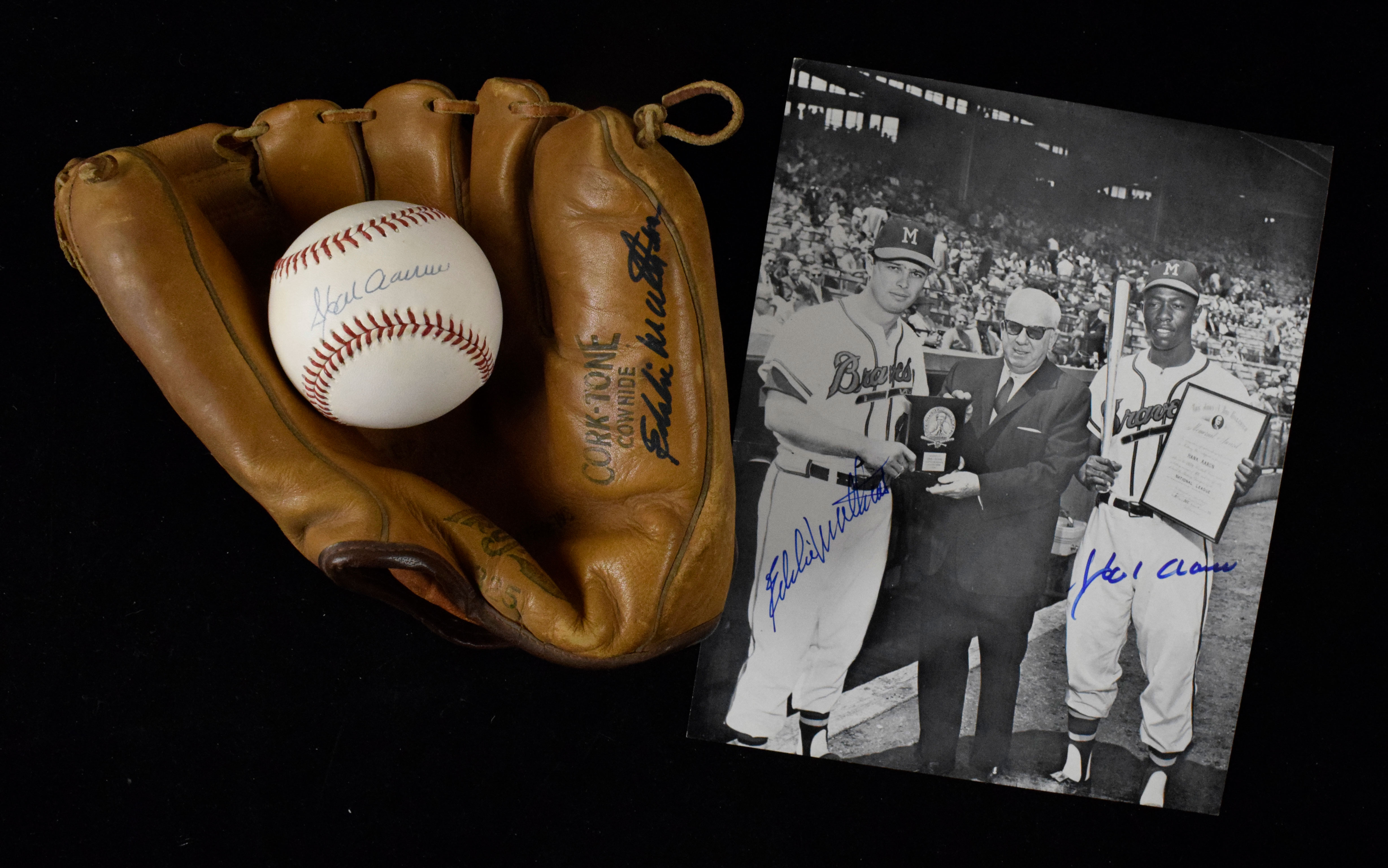 Description:Hank Aaron & Eddie Mathews dual-signed photo plus Mathews signed glove & Aaron signed baseball (VG/EX-NM). Includes c.mid-late 1950s TruSport 325 Ed Mathews model glove signed by Mathews in blue marker (VG/EX), 8"x10" photo signed by both Mathews and Aaron, and W.White NL ball (light toning) signed by Hank Aaron. Signatures rate 8 to 10 out of 10: VG/EX-NM