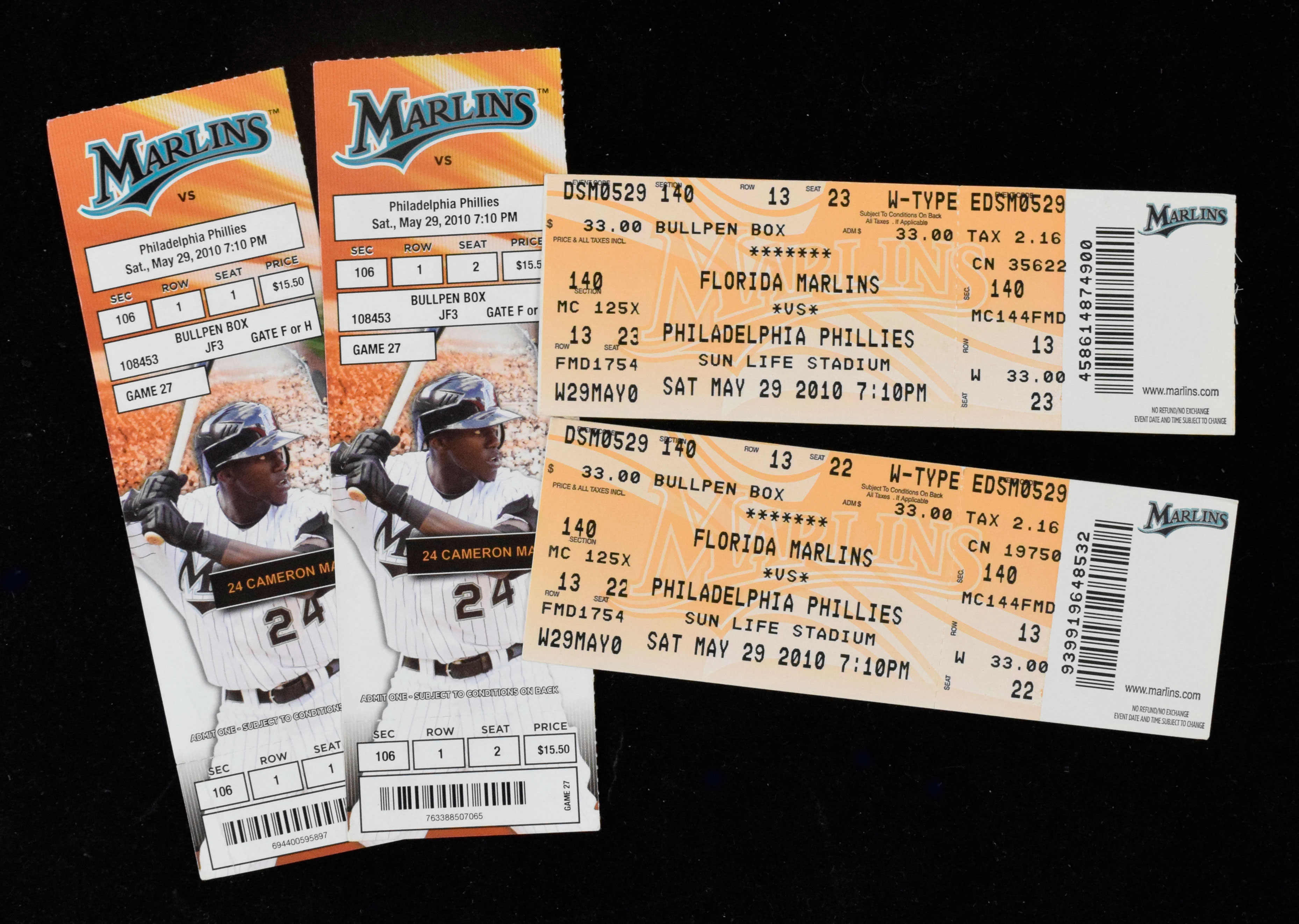 Description:Lot of (4) 2010 Roy Halladay perfect game full tickets (VG-NM/MT). Includes (4) 5/29/2010 Philadelphia Phillies at Florida Marlins full tickets for game in which Halladay pitched a perfect game. Includes (2) season tickets (VG-EX/MT) and (2) box office tickets (EX-NM/MT).