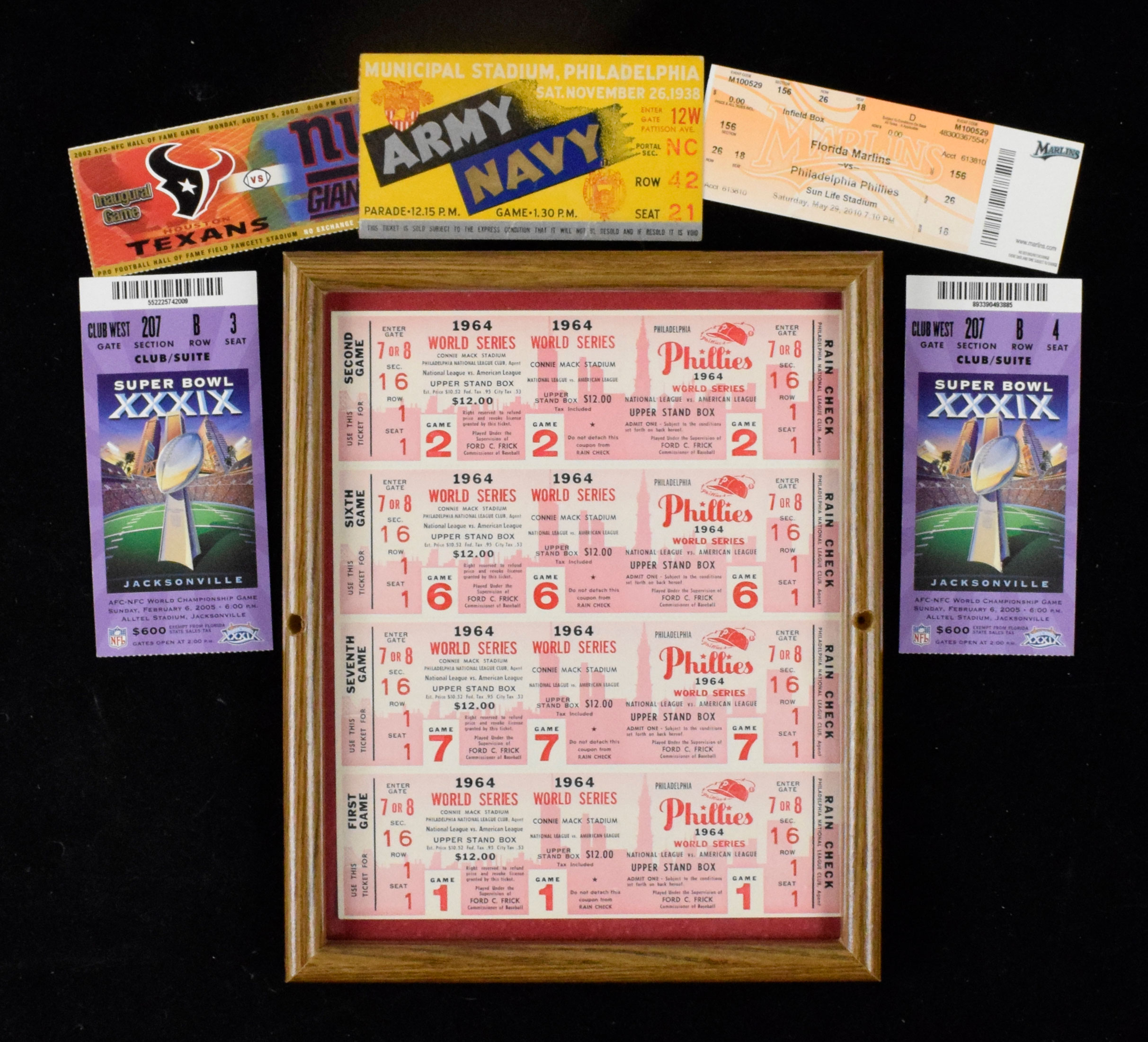 Description:Baseball and football ticket lot from 1938-2010 (GD-NM). Includes 11/26/1938 Army vs Navy ticket stub (GD), uncut sheet of (4) 1964 Philadelphia Phillies phantom World Series tickets (framed), 8/5/2002 Pro Football Hall Of Fame Game ticket stub for Houston Texans vs New York Giants which was the Texans inaugural game (VG/EX), (2) Super Bowl XXXIX ticket stubs (EX/MT-NM), and 5/29/2010 Phillies at Florida Marlins full ticket for Roy Halladay's perfect game (EX/MT).