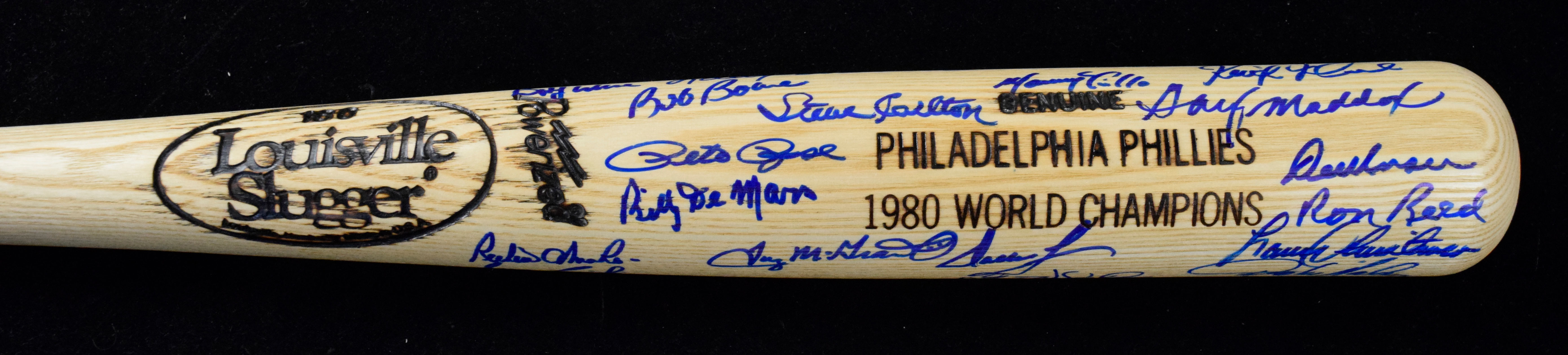 Description:1980 Philadelphia Phillies team signed baseball bat (NM). 34" Louisville Slugger 1980 World Champions bat signed by (32) including Dallas Green, Steve Carlton, Pete Rose, Tug McGraw, Larry Bowa, Bob Boone, Greg Luzinski, Garry Maddox, Manny Trillo, Bake McBride, Ron Reed, Dick Ruthven, Lonnie Smith, Marty Bystrom, Larry Christenson, Del Unser, Greg Gross, John Vukovich, Dickie Noles, George Vukovich, Keith Moreland, Warren Brusstar, and others. Signatures rate 8 to 9/10 out of 10: NM