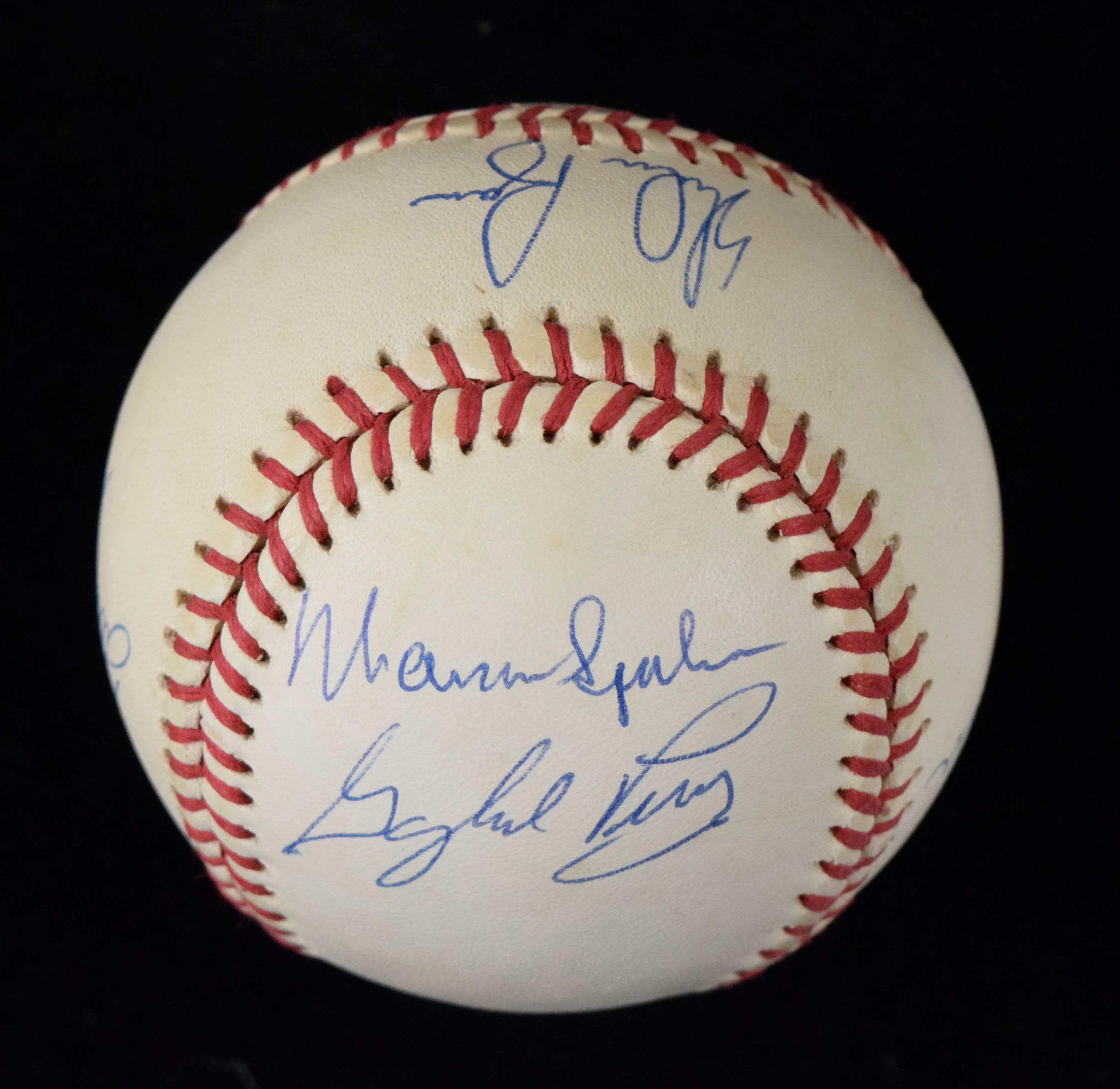 Description:300 Win Club multi-signed baseball - JSA (EX/MT). B.Brown AL ball signed by (6) including Don Sutton, Waren Spahn, Tom Seaver, Gaylord Perry, Nolan Ryan, and Steve Carlton. Signatures rate 8 to 9/10 out of 10. Includes LOA from JSA, with matching serial #ed sticker on the ball. Light, even toning: EX/MT