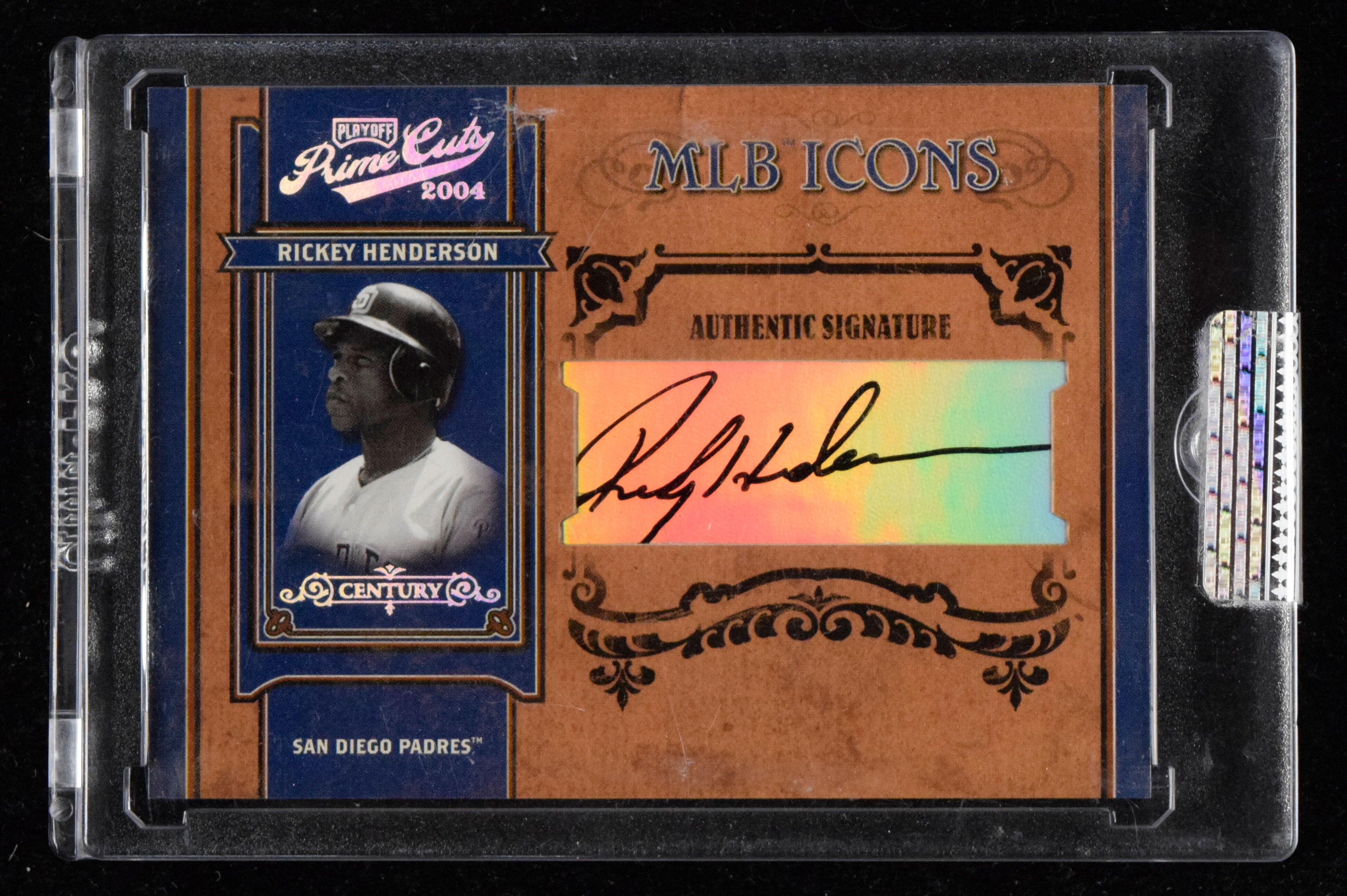 Description:Rickey Henderson signed 2004 Playoff Prime Cuts serial numbered insert card (NM/MT). 2004 Playoff Prime Cuts "MLB Icons Signature Century Silver" #MLB-85 signed by Henderson in black marker. Signature rates 9 out of 10. The card is #ed 5/24: NM/MT