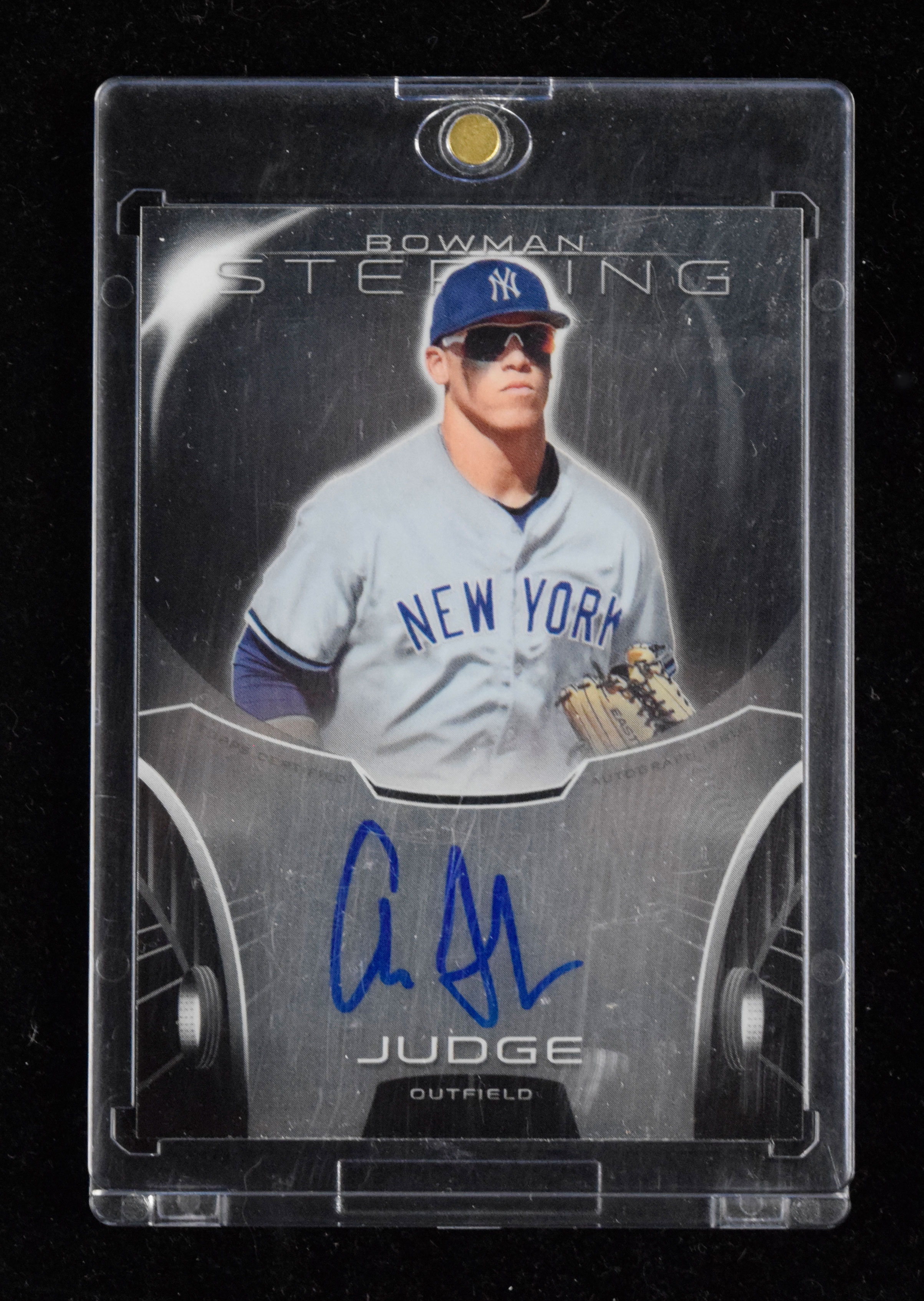 Description:Aaron Judge signed 2013 Bowman Sterling rookie insert card (NM). 2013 Bowman Sterling "Prospect Autographs" #BSAP-AJ signed by Judge in blue marker. Signature rates 9 out of 10: NM