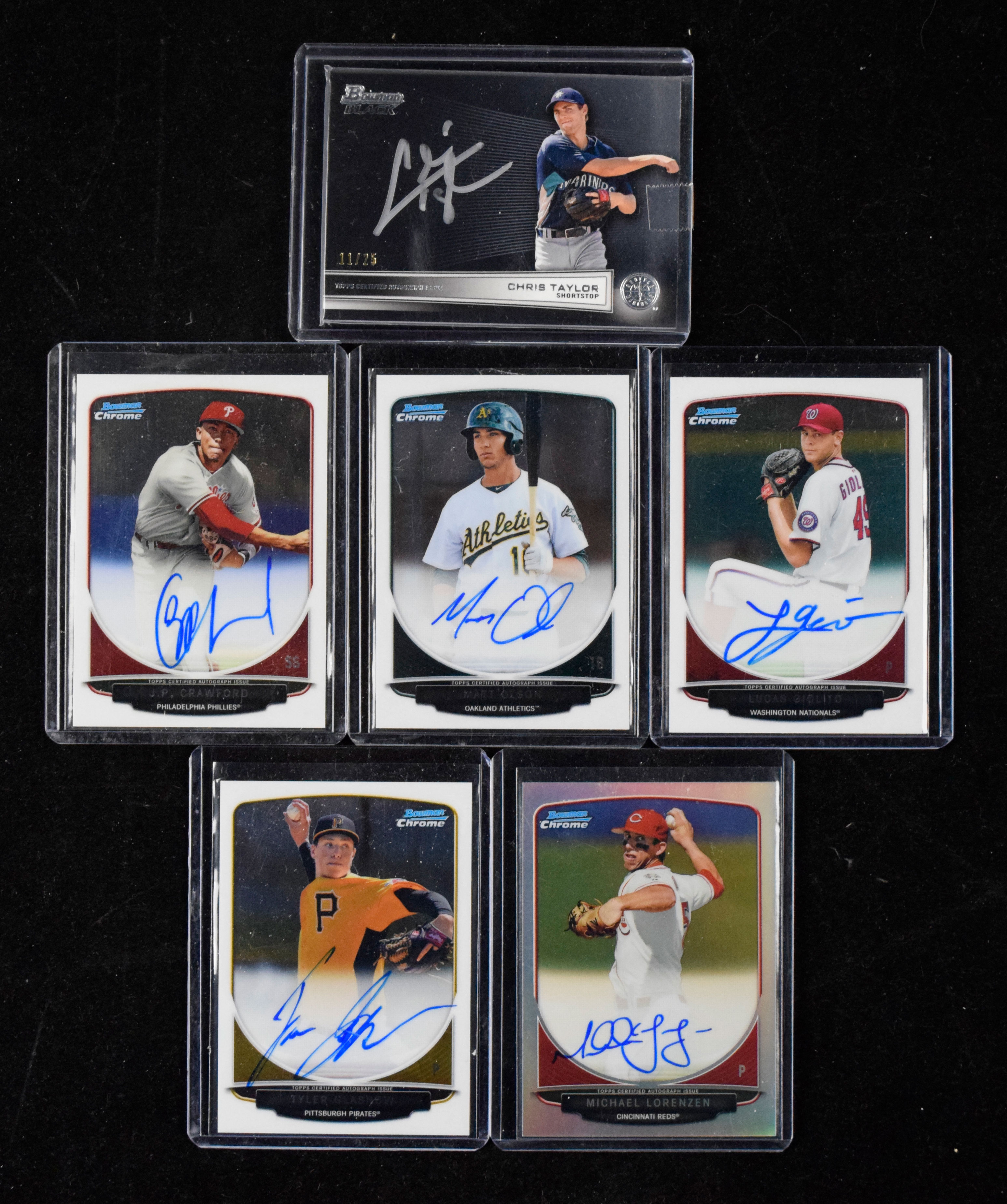 Description:Lot of (100) signed baseball rookie and insert cards (NM-NM/MT overall). Nearly all are from 2013-2014. Includes Matt Olson, Chris Taylor, J.P. Crawford, Lucas Giolito, Tyler Glasnow, Michael Lorenzen, and many others. Signatures rate 7 to 10 (avg 9) out of 10: NM-NM/MT overall