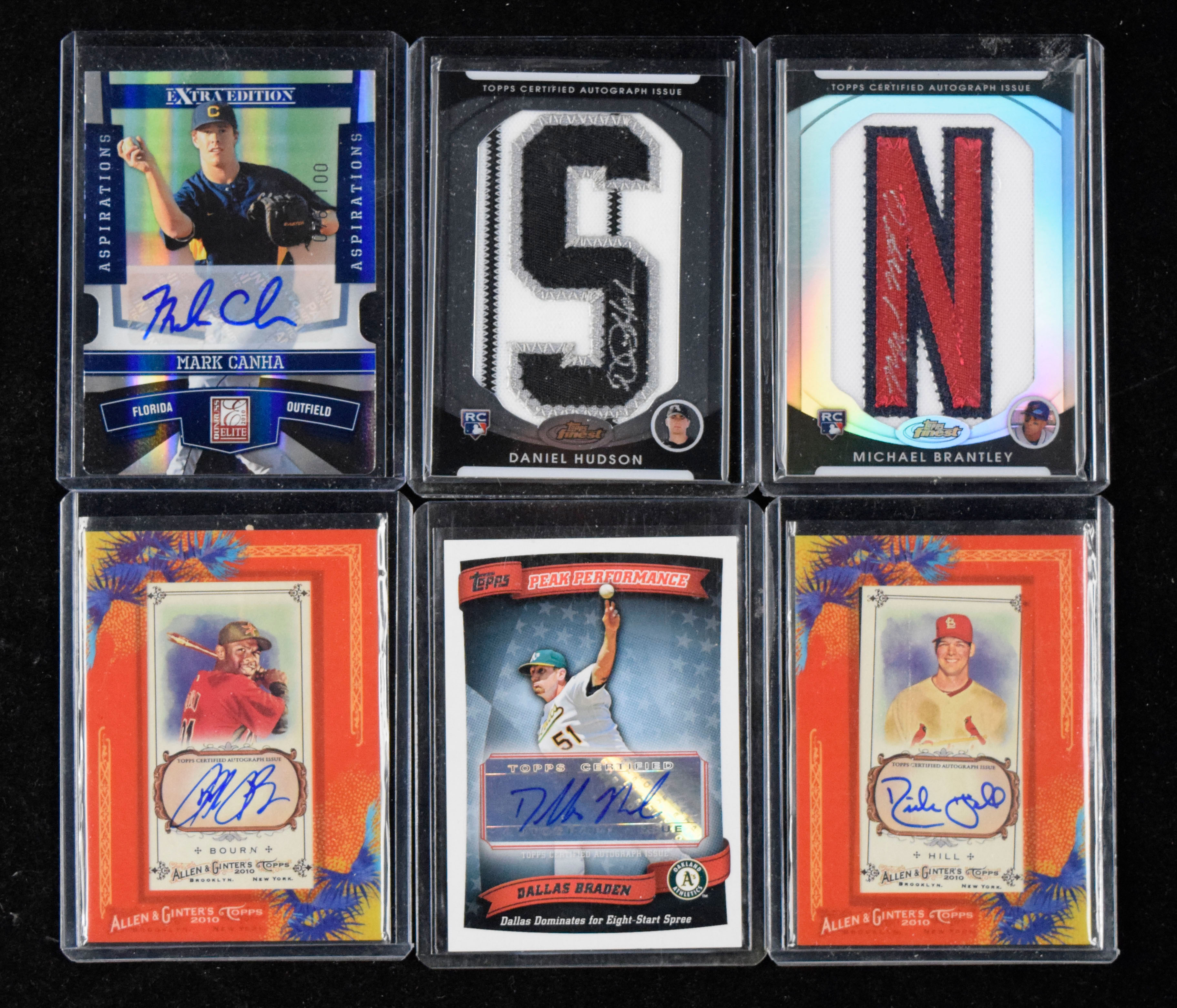 Description:Lot of (100) signed baseball rookie and insert cards (NM-NM/MT overall). Nearly all are from 2009-2010. Includes Michael Brantley, Mark Canha, Daniel Hudson, Ian Desmond, Dallas Braden, Michael Bourn, Rich Hill, and many others. Signatures rate 7 to 10 (avg 9) out of 10: NM-NM/MT overall