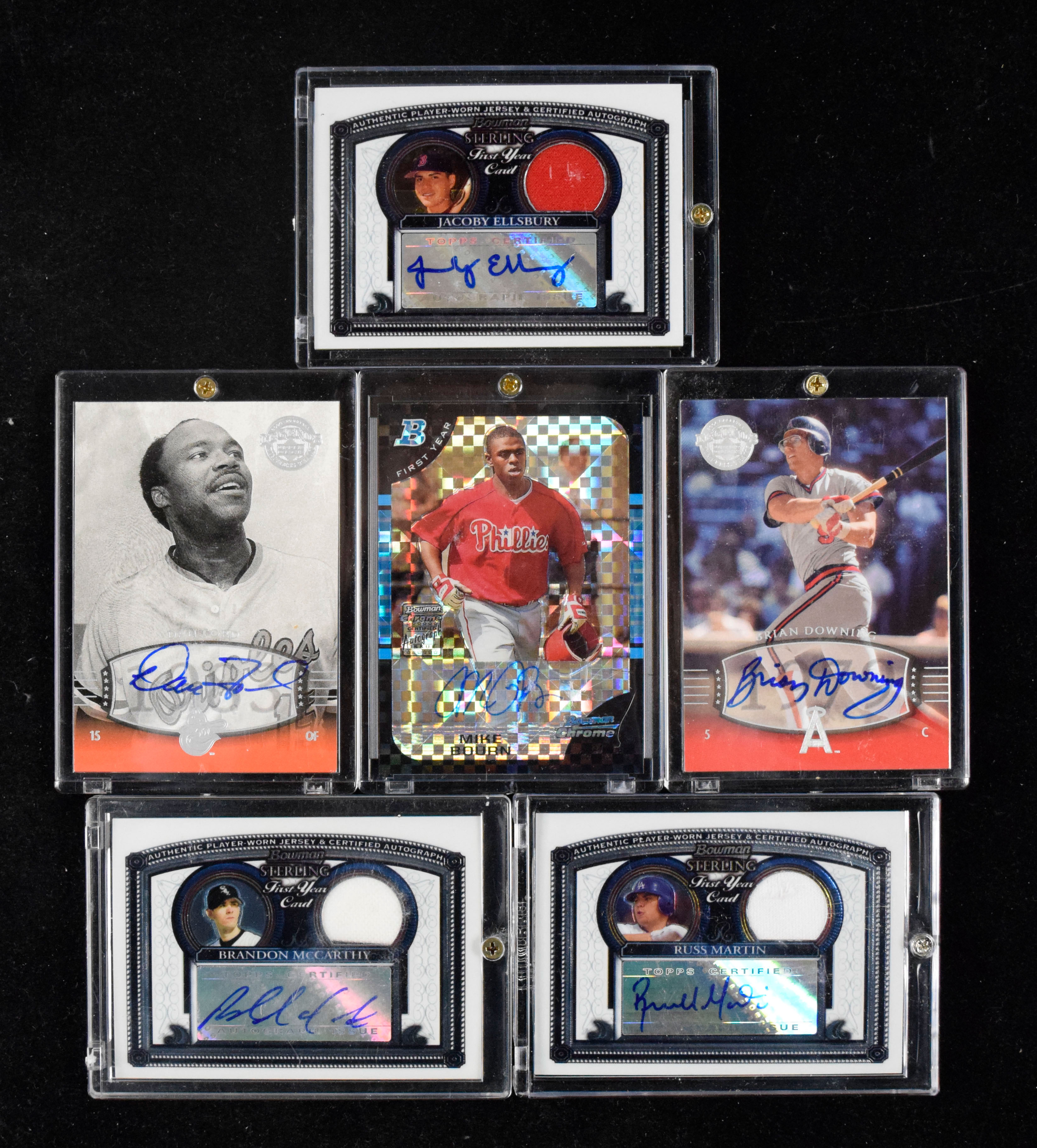 Description:Lot of (100) signed baseball rookie and insert cards (NM-NM/MT overall). Nearly all are from 2004-2005. Includes Brian Downing, Brian Doyle, Dan Ford, Michael Bourn, Jacoby Ellsbury, Russell Martin, John Mayberry Jr, Mike Morse, Brandon McCarthy, Greg Dobbs, and many others. Signatures rate 7 to 10 (avg 9) out of 10: NM-NM/MT overall