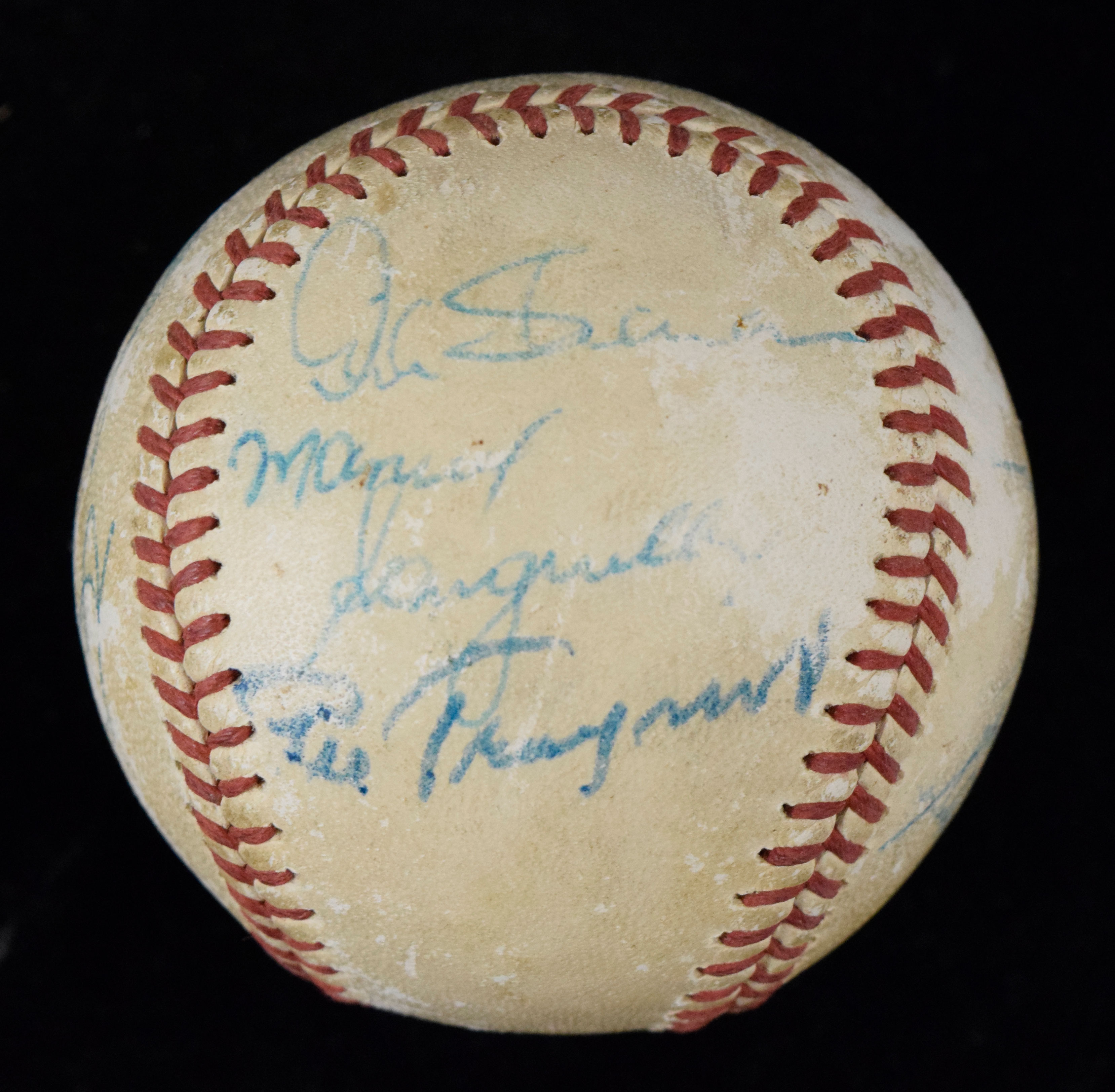 Description:Pie Traynor and others multi-signed baseball (VG). J.Cronin AL ball signed by (9) including Pie Traynor, Don DiMaggio, Steve Blass, Gene Clines, Richie Zisk, Manny Sanguillen, Bob Miller, Jackie Hernandez, and Jose Pagan. Signatures rate 2/3 (Zisk) to 8 (avg 6/7) out of 10. Scattered wear including spots of surface loss where the ball was signed: VG