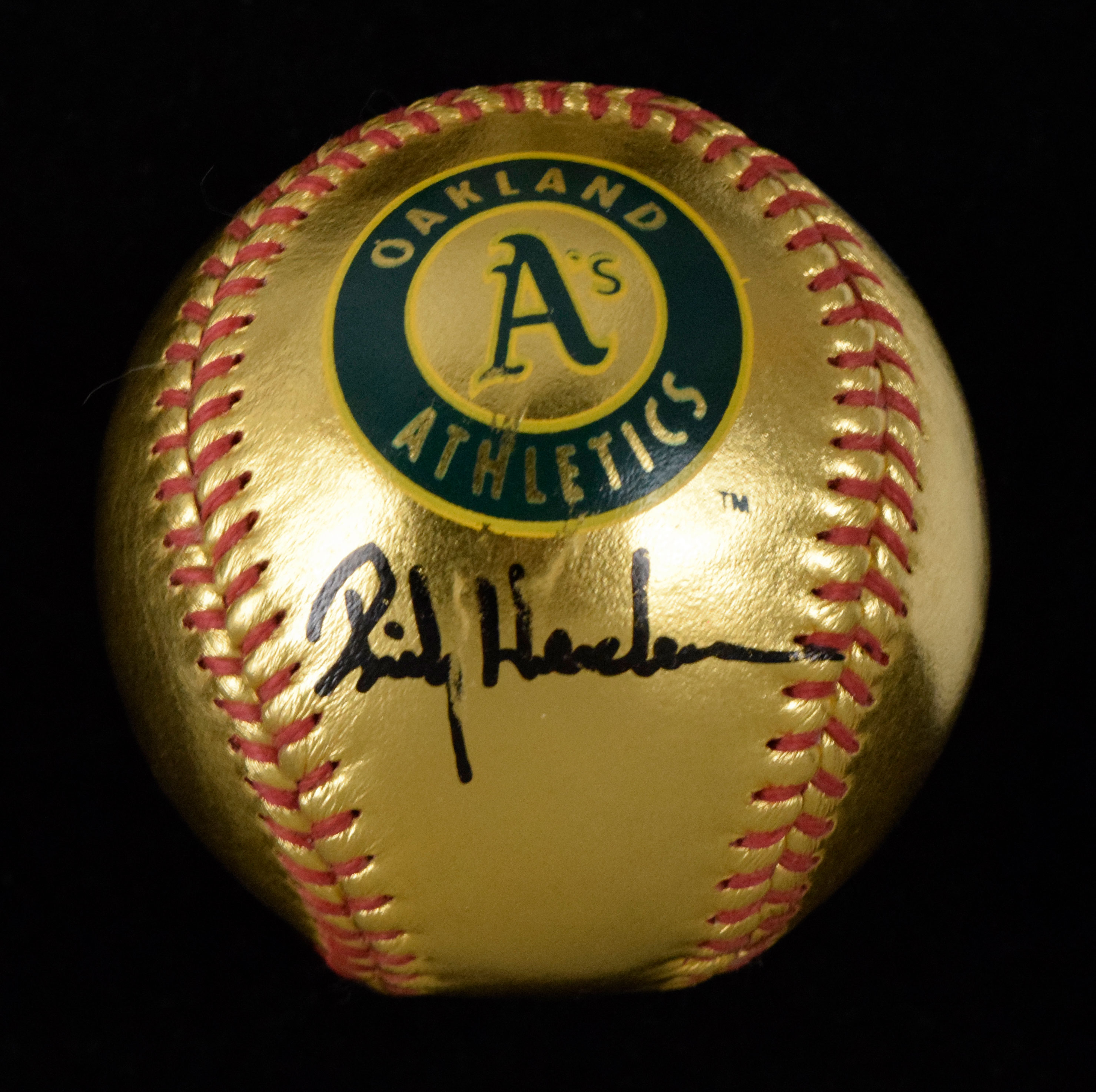 Description:Rickey Henderson signed gold leather baseball (EX/MT). Oakland A's logo ball signed by Henderson in black marker. Signature rates 7/8 out of 10. Dave & Adam's serial #ed hologram sticker is on the ball. Small scuff marks including some around the autograph: EX/MT