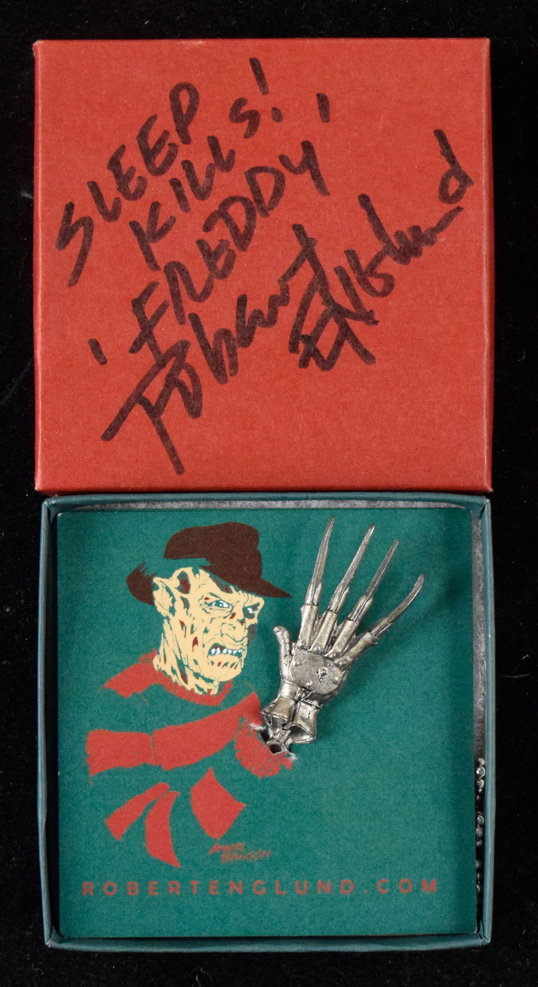 Description:Robert Englund signed and inscribed Freddy Krueger necklace (NM). The necklace remains in its original box, and Englund signed the lid in black marker and added "Sleep Kills!" "Freddy" inscriptions. Signature rates 9 out of 10: NM