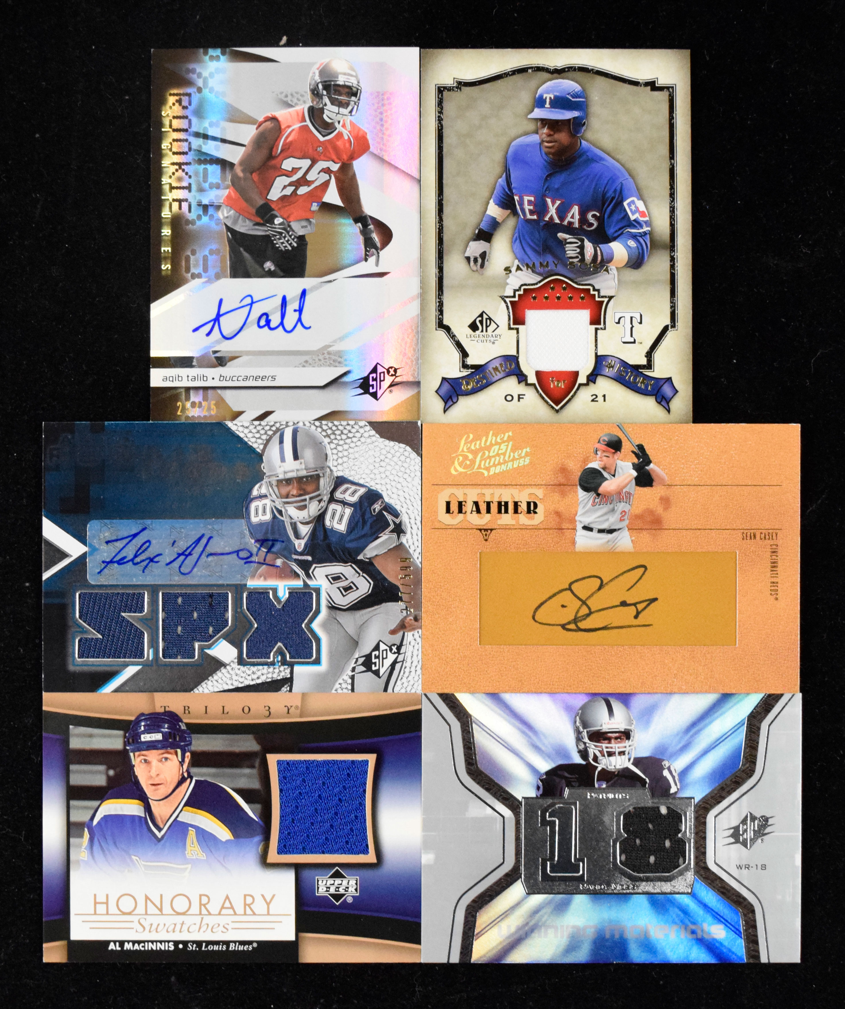 Description:Mixed sports lot of (108) signed and relic swatch insert cards (NM-NM/MT overall). Includes (31) relic cards: Al MacInnis, Owen Nolan, Randy Moss, Daunte Culpepper, Ted Ginn Jr, Vince Young, Jake Delhomme, Sammy Sosa, Jorge Posada, Rocco Baldelli, Robinson Cano, Barry Zito, Bernie Williams, Ryan Zimmerman, Miguel Tejada, and others; and (77) signed cards: Sean Casey, Carlos Quentin, James Loney, Tyler Stephenson, Aqib Talib, Chris Long, Felix Jones, Michael Robinson, and others. Signatures rate 7 to 10 (avg 8/9) out of 10: NM-NM/MT overall