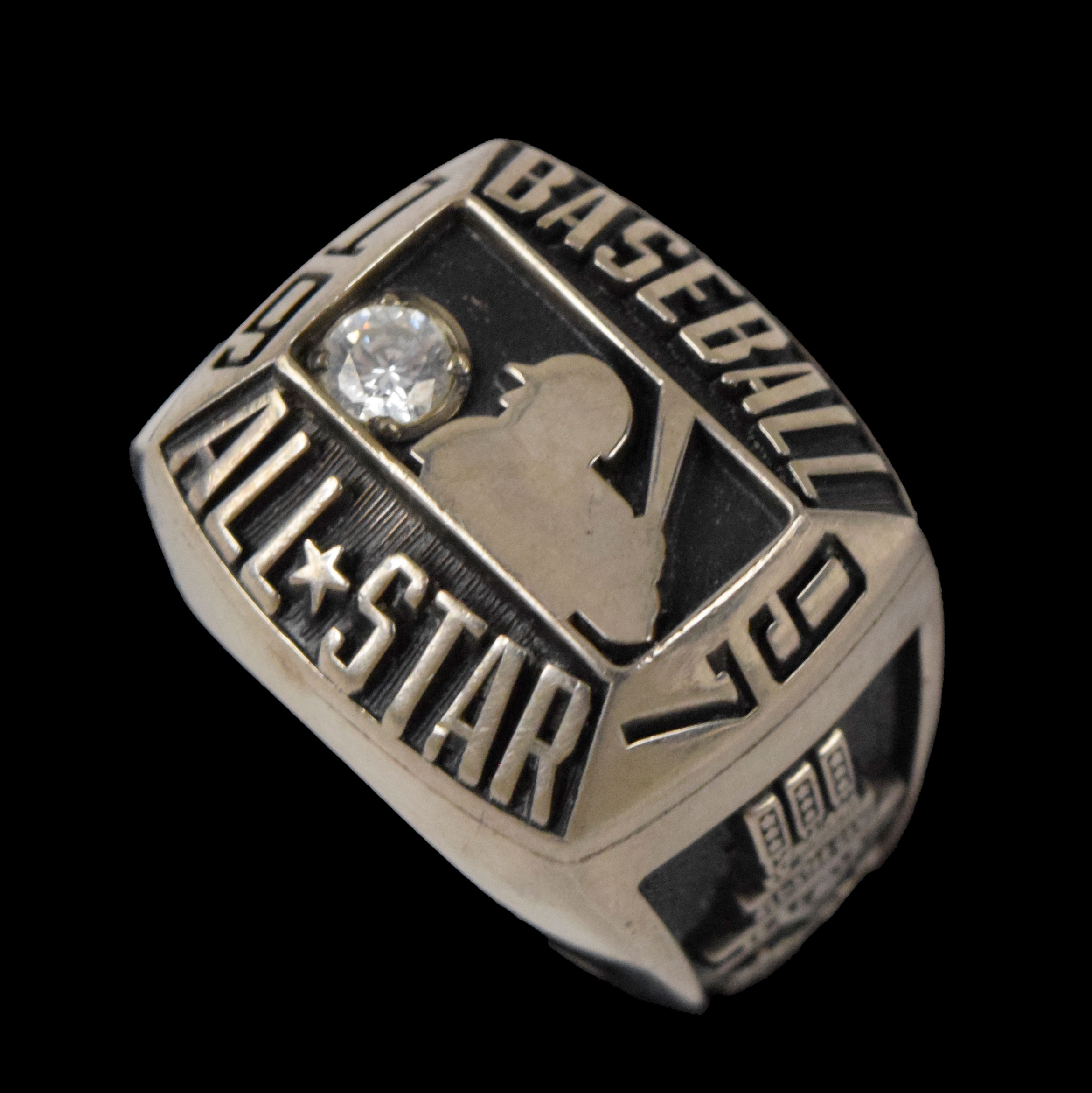 Description:1997 MLB All-Star Game presentational ring (NM). Size 10.5 ring issued for the game played in Cleveland. MLB logo face is accented with .15 carat diamond and lettered "1997 Baseball All Star" around the edge. One shank has the 1997 All-Star Game logo, and the other has American League logo. Marked "AST JOSTENS" on the interior band: NM