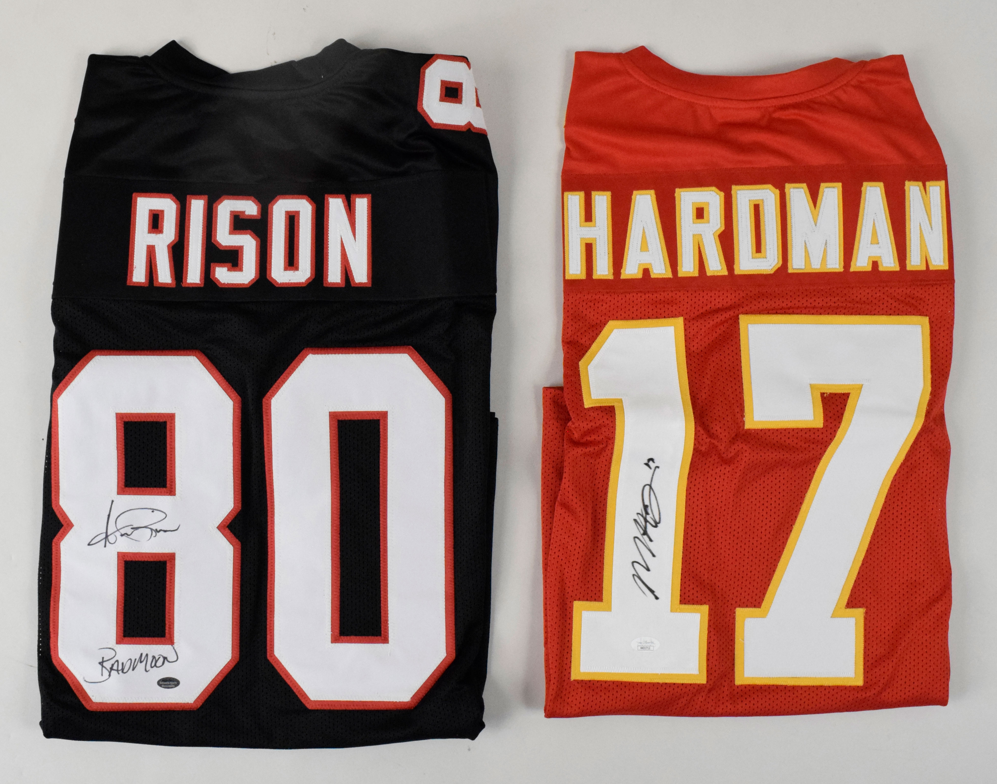 Description:O.J. Anderson, Andre Rison, Mecole Hardman, D.J. Moore signed jerseys (NM-NM/MT). Includes size XL #24 O.J. Anderson jersey signed by Anderson (Schwartz Sports), size XL #17 Mecole Hardman jersey signed by Hardman (JSA), size XL #12 D.J. Moore jersey signed by Moore (JSA), and size XL #80 Andre Rison jersey signed by Rison with "Bad Moon" inscription (Schwartz Sports). Signatures rate 8 to 9 out of 10. No maker tagging: NM-NM/MT