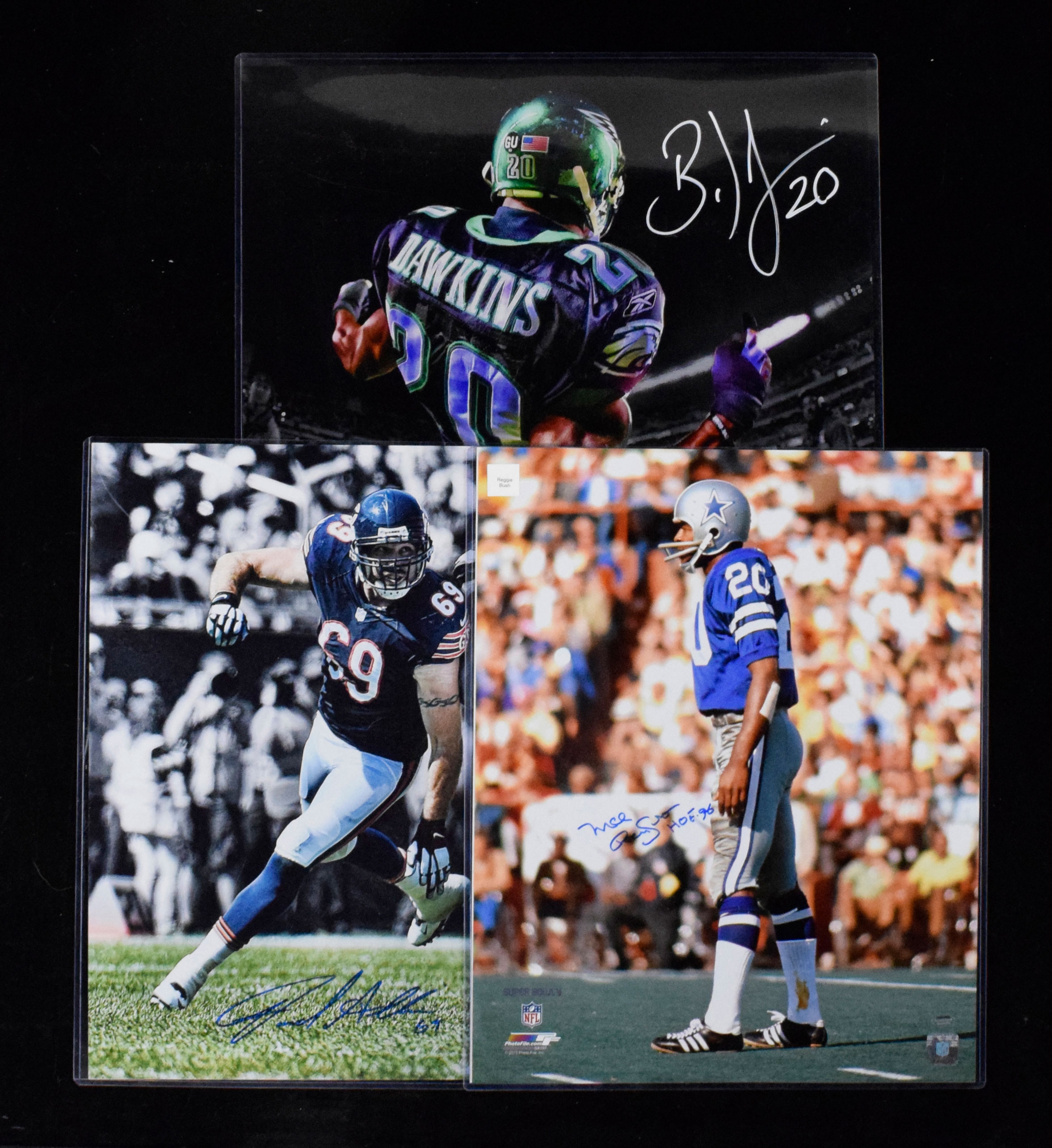 Description:Lot of (6) football stars and HOFers signed 16"x20" photographs (NM-NM/MT). Includes Brian Dawkins (JSA), Mel Renfro with "HOF 96" inscription (Schwartz Sports), Jared Allen (PSA/DNA), Reggie Bush (PSA/DNA), Allen Robinson (Schwartz Sports), and Arian Foster (JSA & PSA/DNA). Signatures rate 8 to 10 out of 10: NM-NM/MT