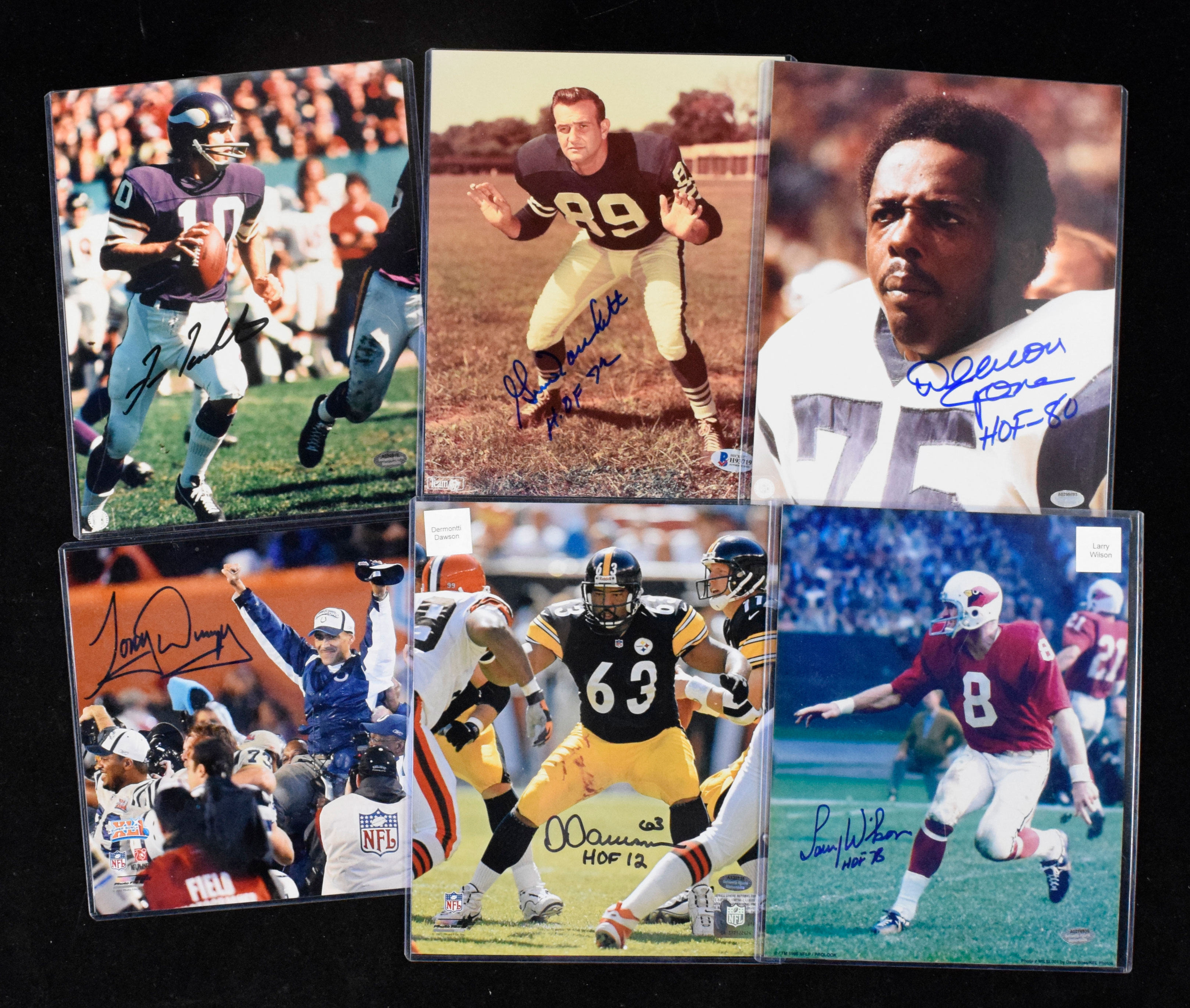 Description:Lot of (13) Football HOFers signed 8"x10" photographs (NM-NM/MT overall). Includes Chuck Bednarik with "HOF 67" inscription, Gini Marchetti with "HOF 72" inscription (Beckett), Larry Wilson with "HOF 78" inscription (Schwartz Sports), Deacon Jones with "HOF 80" inscription (Schwartz Sports), Paul Krause with "HOF 98" inscription (Schwartz Sports), Fran Tarkenton (Schwartz Sports), Dermontti Dawson with "HOF 12" inscription (Schwartz Sports), Tony Dungy (Steiner), Brett Favre (Schwartz Sports and Favre Authenticated), Ted Hendricks (Schwartz Sports), Lawrence Taylor (Schwartz Sports), Mel Renfro (Schwartz Sports), and Marv Levy with "HOF 01" inscription (Schwartz Sports). Signatures rate 8 to 10 out of 10: NM-NM/MT overall