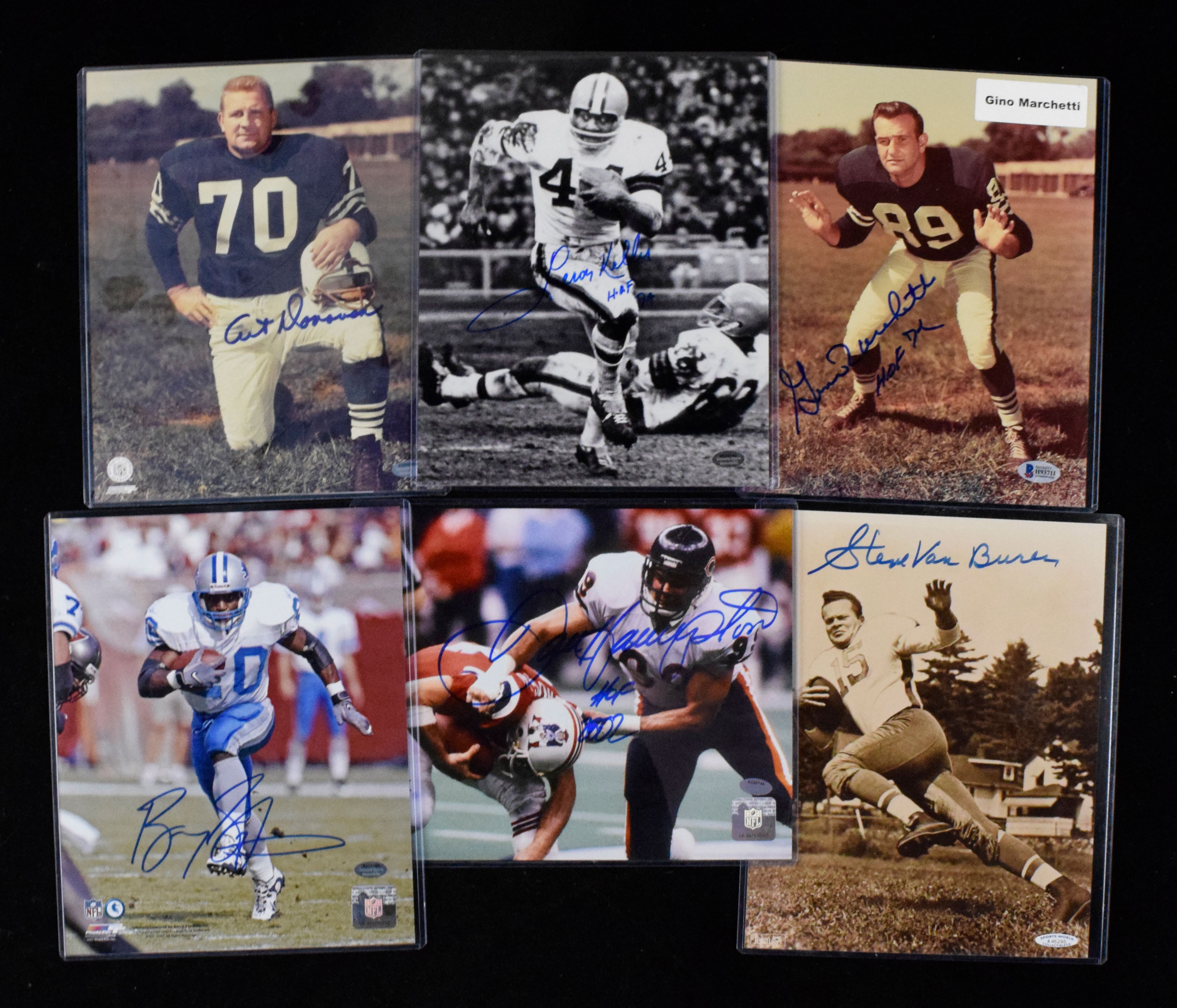 Description:Lot of (13) Football HOFers signed 8"x10" photographs (NM-NM/MT overall). Includes Steve Van Buren, Art Donovan (Schwartz Sports), Gino Marchetti with "HOF 72" inscription (Beckett), Paul Hornung (Schwartz Sports), Willie Brown with "HOF 84" inscription (Schwartz Sports), Barry Sanders (Schwartz Sports), Dan Hampton with "HOF 2002" inscription (Schwartz Sports), Jack Youngblood with "HOF 01" inscription (Schwartz Sports), Andre Reed with "HOF 14" inscrption (Schwartz Sports), John Elway (PSA/DNA), Leroy Kelly with "HOF 94" inscription (Schwartz Sports), Lawrence Taylor (Schwartz Sports), and Marv Levy with "HOF 01" inscription (Schwartz Sports). Signatures rate 8 to 10 out of 10: NM-NM/MT overall