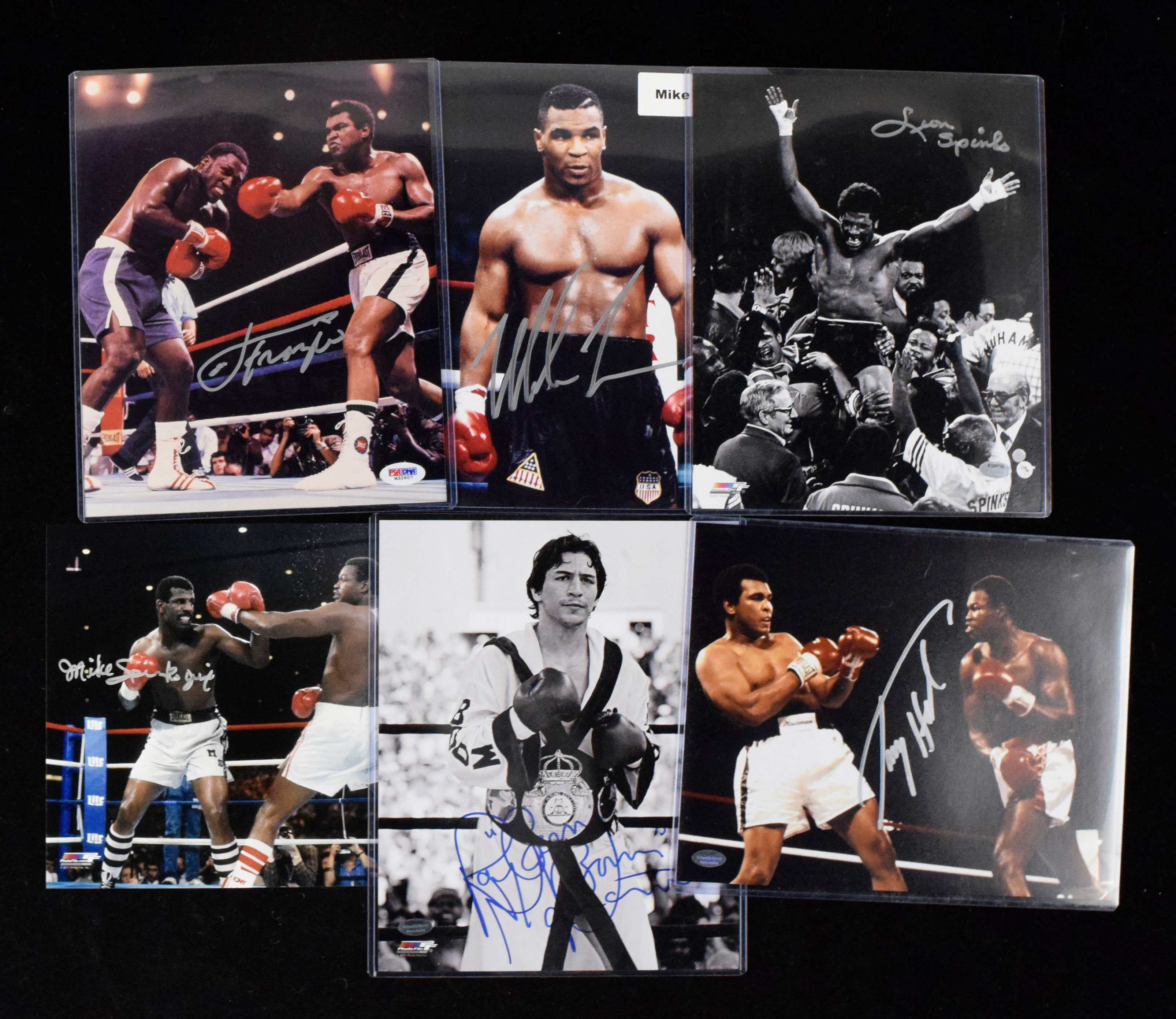 Description:Lot of (12) boxing stars and HOFers signed 8"x10" photographs (NM-NM/MT). Includes Joe Frazier (PSA/DNA), Leon Spinks (Schwartz Sports), Ray "Boom Boom" Mancini (Schwartz Sports), Larry Holmes (Schwartz Sports), Mike Spinks with "Jinx" inscription (Schwartz Sports), (2) Mike Tyson (JSA and PSA/DNA), Aaron "Superman" Davis (Schwartz Sports), Oliver McCall (Schwartz Sports), Ray Mercer (Schwartz Sports), James Toney (Schwartz Sports), and Terrible Tim Witherspoon (Schwartz Sports). Signatures rate 8 to 10 out of 10: NM-NM/MT