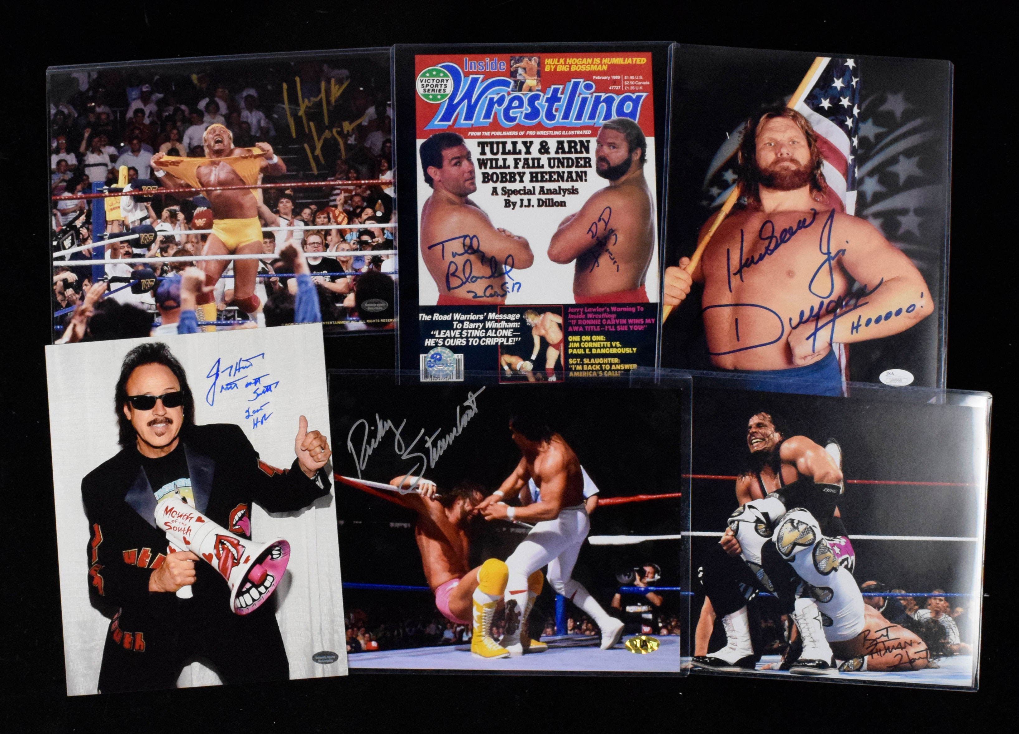 Description:Lot of (15) signed 8"x10" wrestling photos including Hogan (NM-NM/MT overall). Includes dual-signed Arn Anderson and Tully Blanchard. Remainder are single-signed and include Hulk Hogan (Schwartz Sports), Paul Bearer with "RIP" inscription (personalized), Hacksaw Jim Duggan with "HOOOOO!" inscription (JSA), Bret "Hitman" Hart (Beckett), Ricky Steamboat (MAB), Ted DiBiase (personalized), (2) Jimmy Hart (one personalized), Marty Jannetty (Leaf), Adam Page (Leaf), Chris Masters (Leaf), Karl Anderson (Leaf), Santana (Leaf), and Kazuyuki Fujita (Leaf). Signatures rate 8 to 10 out of 10: NM-NM/MT overall