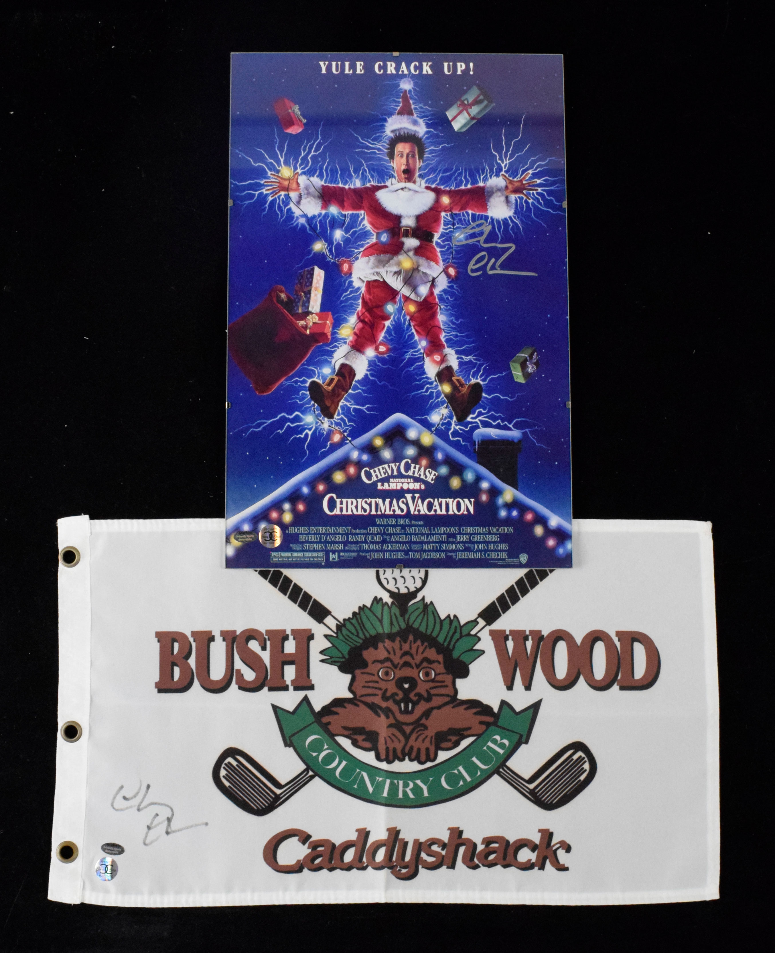 Description:Chevy Chase signed "Christmas Vacation" photo & signed "Caddyshack" golf flag (NM-NM/MT). Includes 11"x17" photo signed by Chase in silver marker rating 9/10 out of 10, and Bush Wood Country Club flag signed by Chase in black marker rating 6/7 out of 10 due to fading. Schwartz Sports and Chevy Chase Authentic hologram stickers are on both items: NM-NM/MT