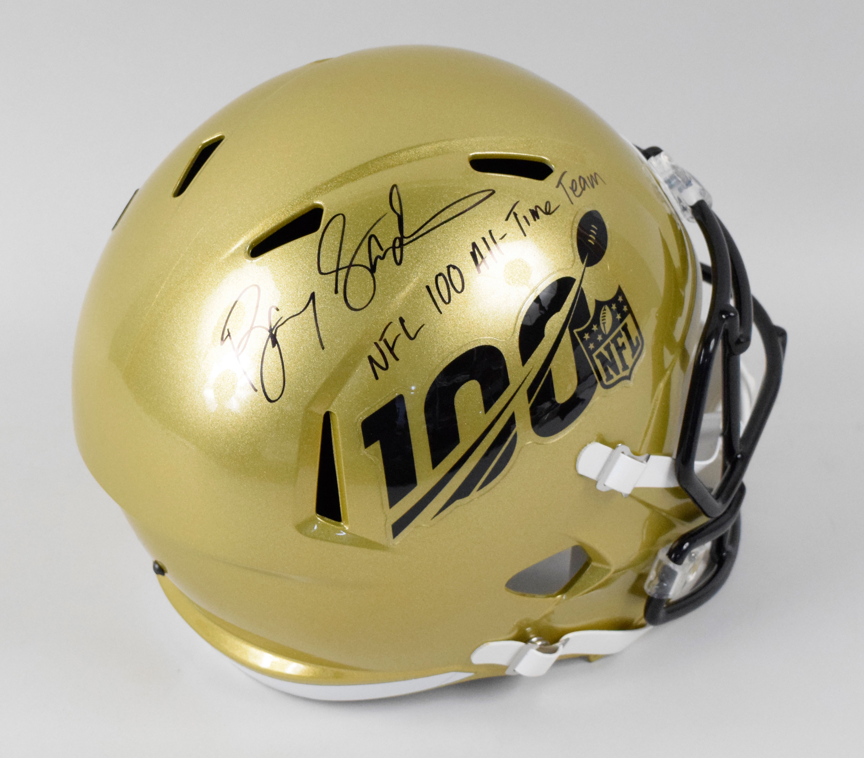 Description:Barry Sanders signed and inscribed NFL All-Time Team full size helmet (NM). Riddell full size NFL 100 replica helmet signed by Sanders in black marker with "NFL 100 All-Time Team" inscription. Signature rates 9 out of 10. Schwartz Sports serial #ed hologram sticker is on the helmet: NM