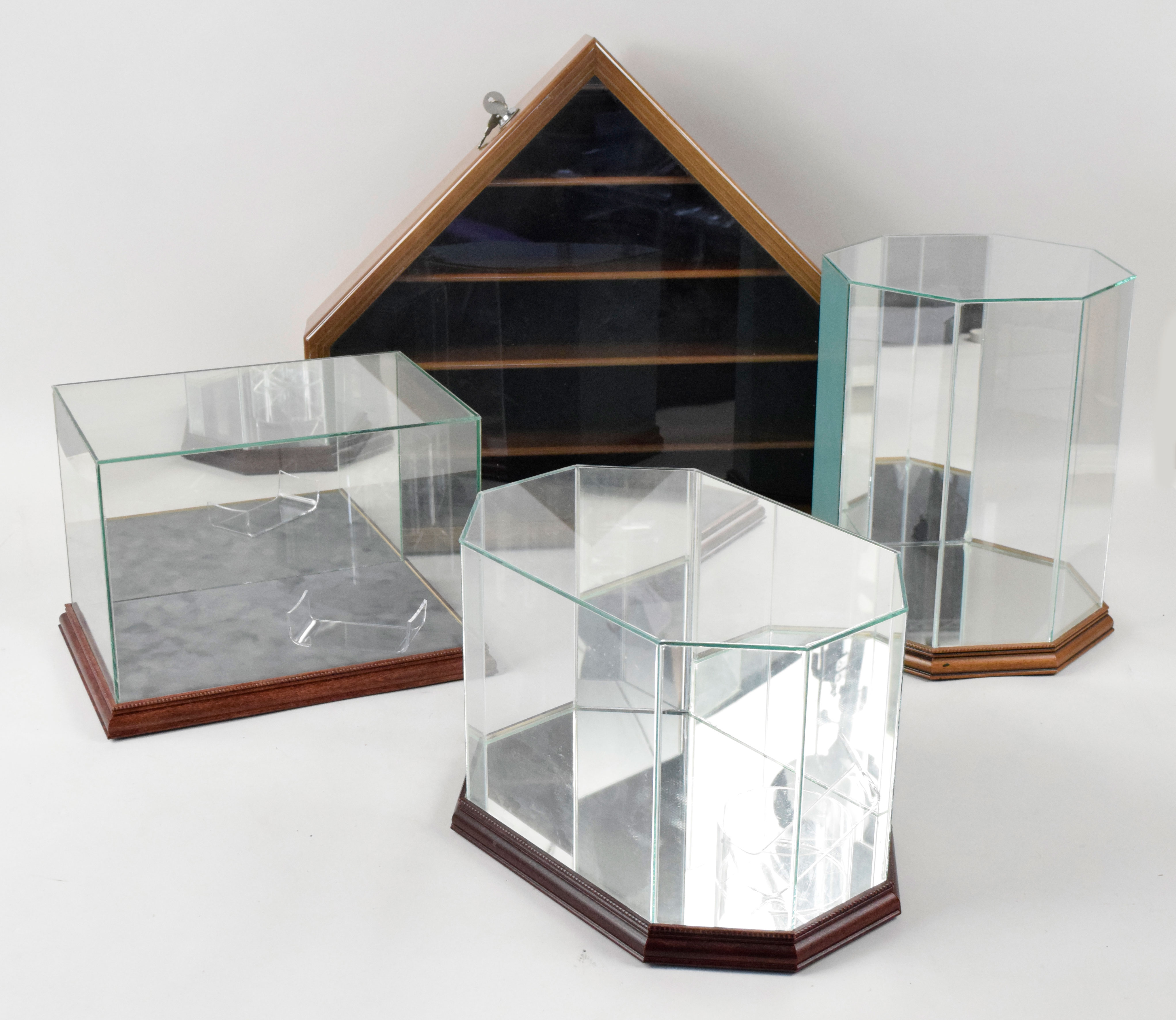 Description:Lot of (4) high quality display cases (EX/MT-NM). Includes a wooden home plate shaped display case with spots for (23) baseballs, (2) glass football display casees, and another glass display case measuring 13" tall x 10" wide: EX/MT-NM