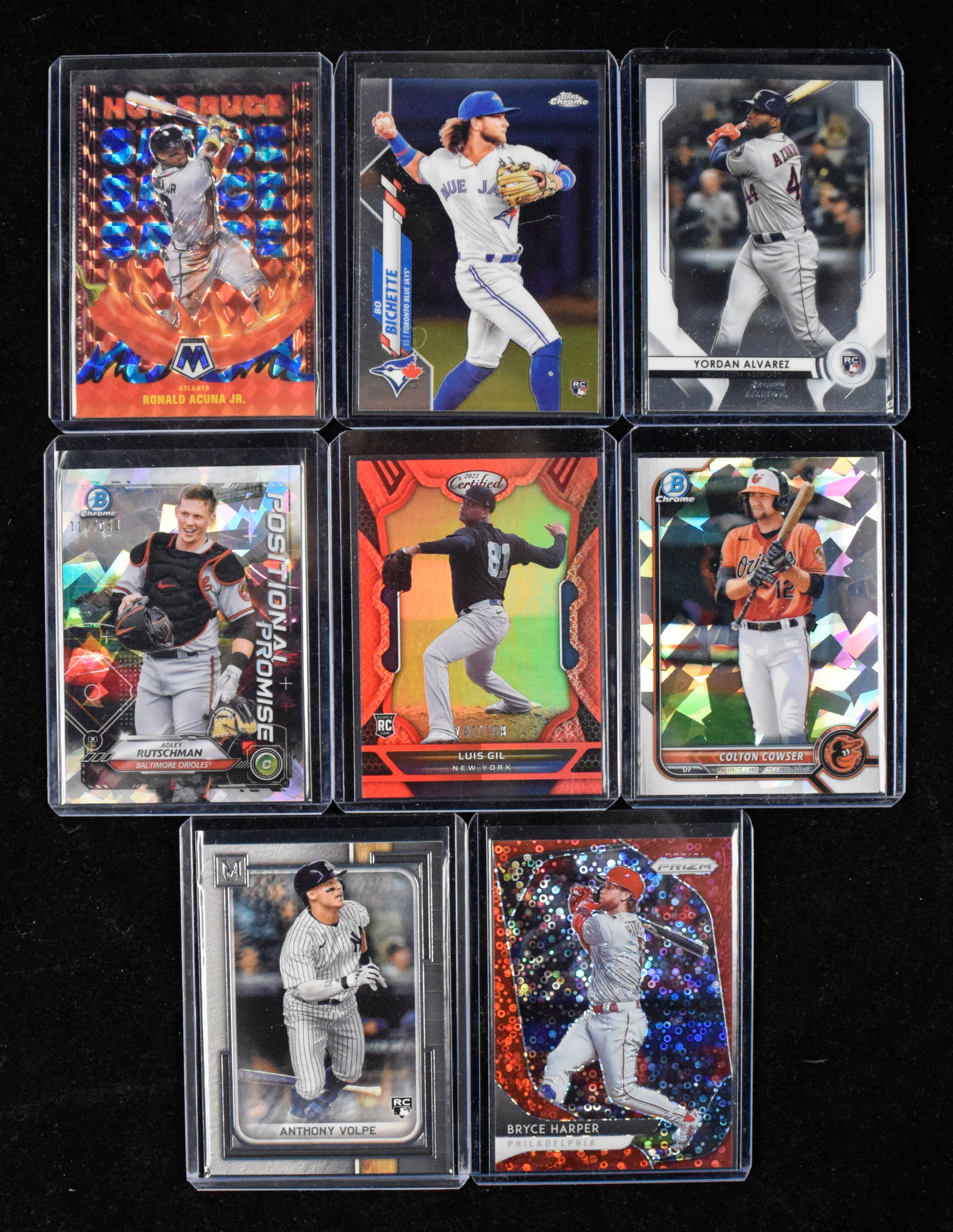 Description:Very nice lot of approx. (1,200) modern baseball cards (NM-NM/MT overall). Mix of Topps, Bowman, and Panini products filled with numerous stars, HOFers, rookies, inserts, parallels, and serial numbered cards. Potential for very nice breakdown value. Various conditions throughout the lot, but most appear to average NM-NM/MT overall, with mant MT cards included.