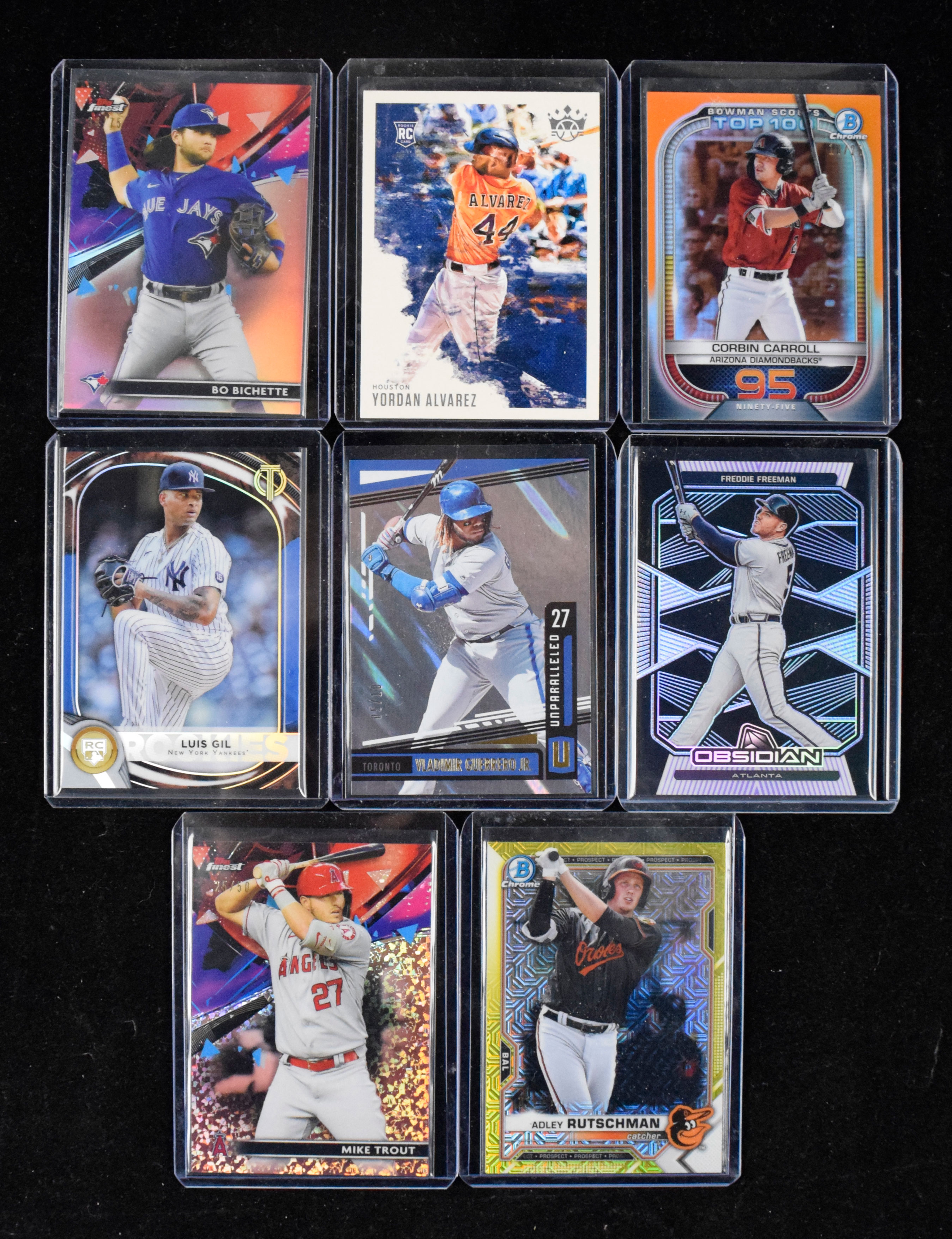 Description:Very nice lot of approx. (1,400) modern baseball cards (NM-NM/MT overall). Mix of Topps, Bowman, and Panini products filled with numerous stars, HOFers, rookies, inserts, parallels, and serial numbered cards. Potential for very nice breakdown value. Various conditions throughout the lot, but most appear to average NM-NM/MT overall, with mant MT cards included.