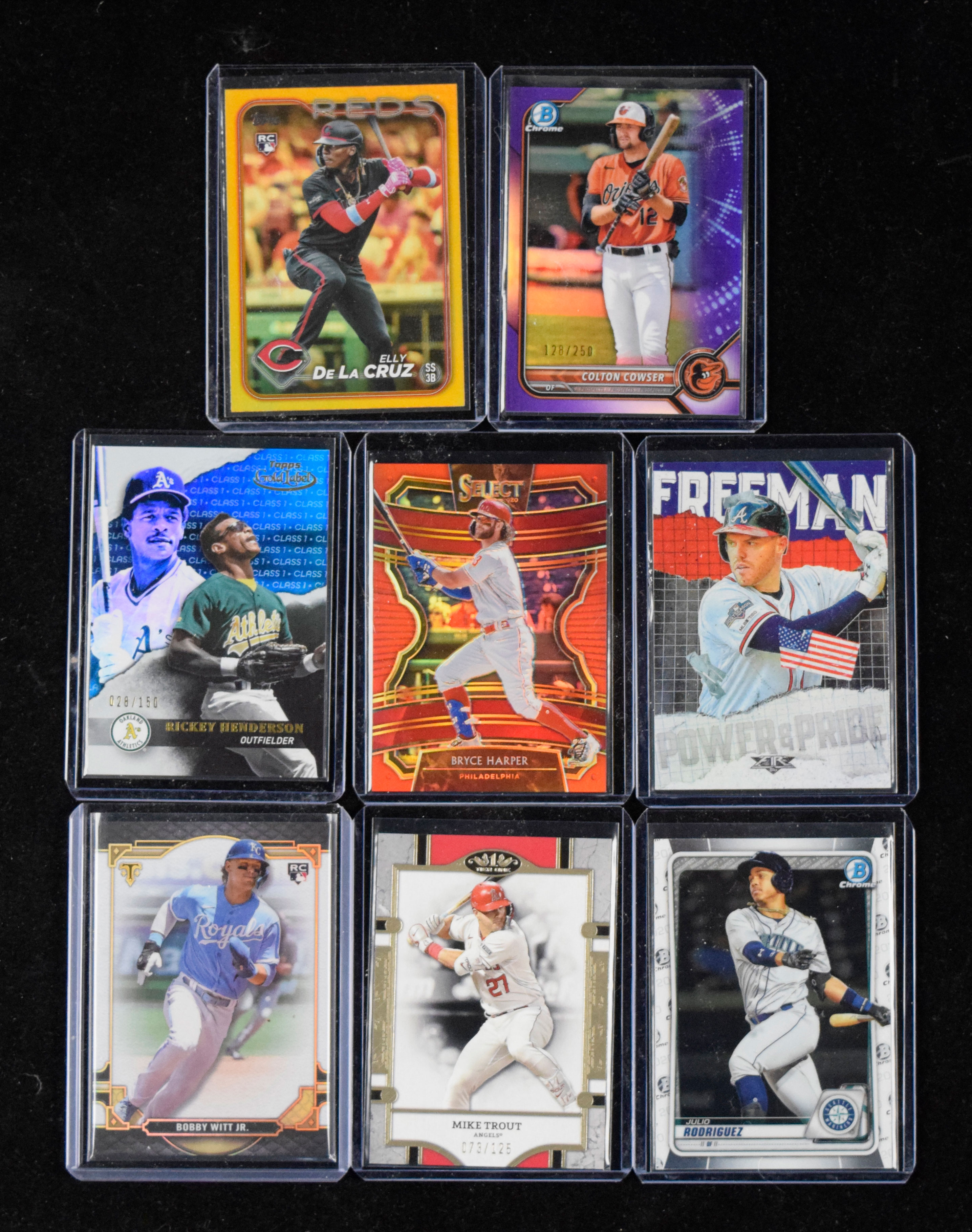 Description:Very nice lot of approx. (1,200) modern baseball cards (NM-NM/MT overall). Mix of Topps, Bowman, and Panini products filled with numerous stars, HOFers, rookies, inserts, parallels, and serial numbered cards. Potential for very nice breakdown value. Various conditions throughout the lot, but most appear to average NM-NM/MT overall, with mant MT cards included.