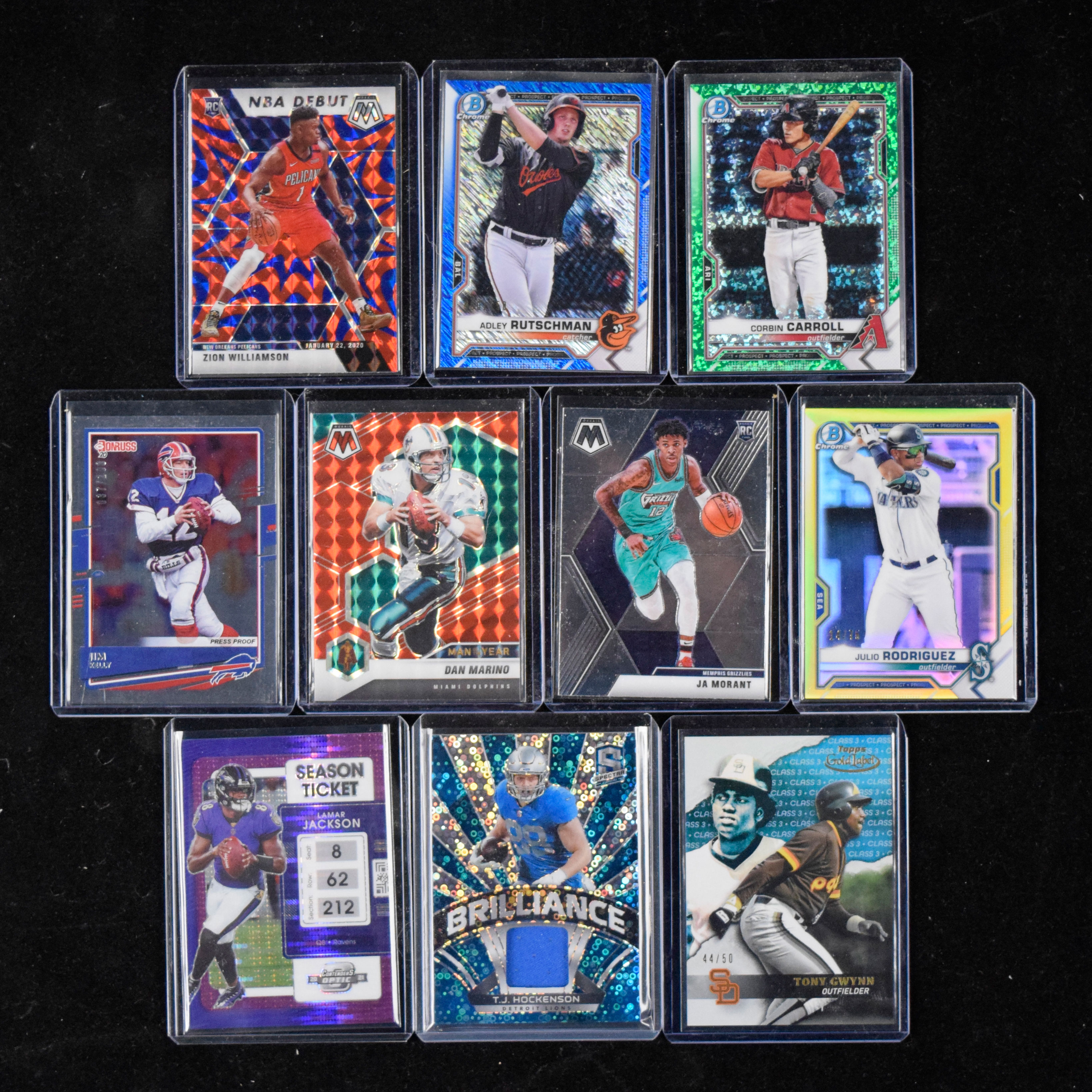 Description:Very nice lot of approx. (2,000) modern baseball, basketball, and football cards (NM-NM/MT overall). Includes approx. 15% baseball, approx. 10% basketball, and approx. 75% football. Mix of Topps, Bowman, and Panini products filled with numerous stars, HOFers, rookies, inserts, parallels, and serial numbered cards. Potential for very nice breakdown value. Various conditions throughout the lot, but most appear to average NM-NM/MT overall, with mant MT cards included.