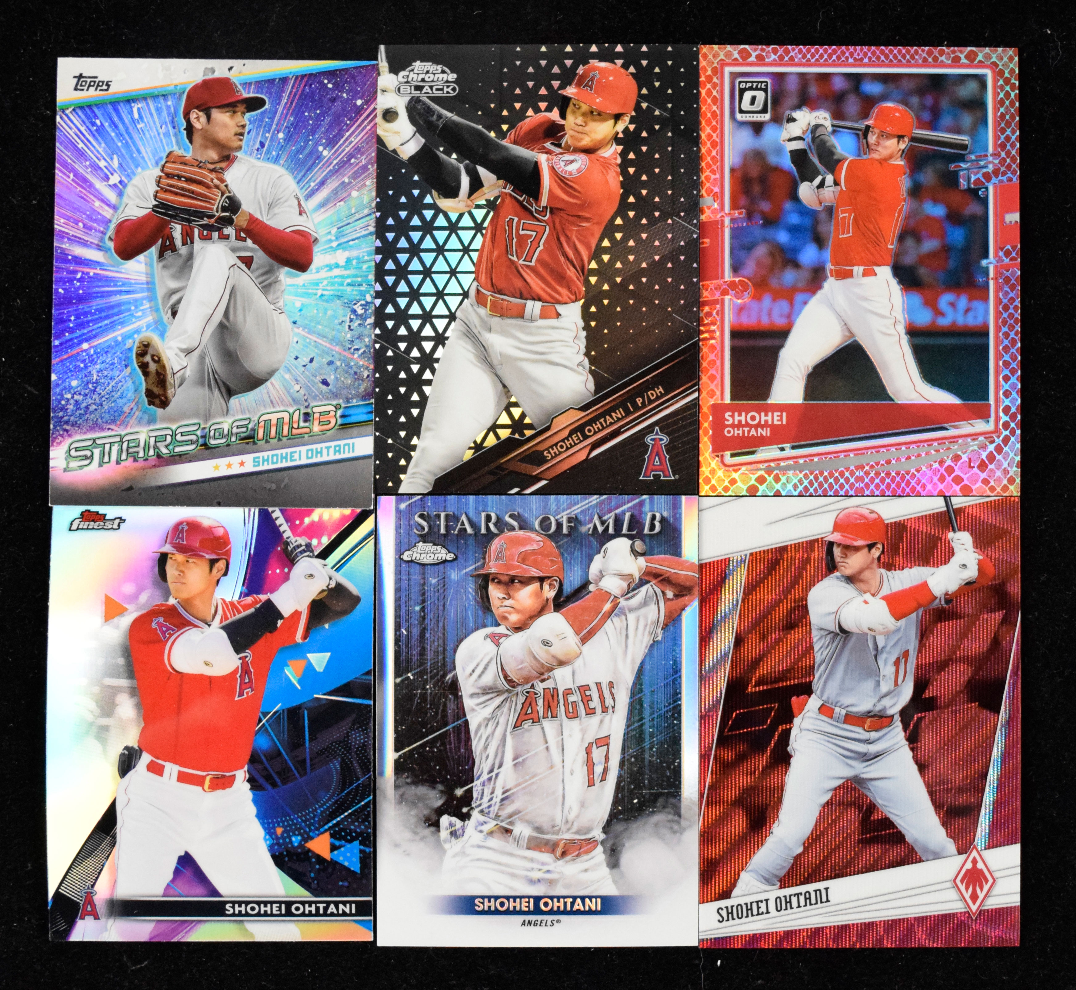 Lot of (19) Shohei Ohtani baseball cards including inserts, parallels, and serial #ed (NM-NM/MT overall). Includes 2020 Topps Chrome "1985 Topps Baseball 35th Anniversary" #85TC-7 Ohtani, 2020 Topps Chrome Black "Refractors" #14 Ohtani (#ed 15/199), 2020 Topps Gypsy Queen #261 Ohtani, 2020 Topps Stadium Club #145 Ohtani, 2020 Bowman #26 Ohtani, 2020 Donruss Optic "Dragon Red" #118 Ohtani (#ed 10/88), 2020 Panini Chronicles "Phoenix Ruby Wave" #17 Ohtani (#ed 74/199), 2020 Panini Contenders #35 Ohtani, 2020 Panini Prizm "Numbers Game" #NG-8 Ohtani, 2021 Topps Finest #54 Ohtani, 2021 Topps Finest "Refractor" #54 Ohtani, 2021 Donruss "Red and White Stripes" #199 Ohtani (#ed 21/2021), 2022 Topps "Stars of MLB Chrome" #SMLBC-24 Ohtani, 2023-24 Topps Now Off-Season #OS-21 Ohtani, 2024 Topps "2023 Greatest Hits" #s 23GH-12 Ohtani and 23GH-14 Ohtani, 2024 Topps "Stars of MLB" #SMLB-21 Ohtani, 2024 Topps "Superstar Blueprint" #SB-3 Ohtani, and 2024 Topps Chrome Black #85 Ohtani: NM-NM/MT overall
