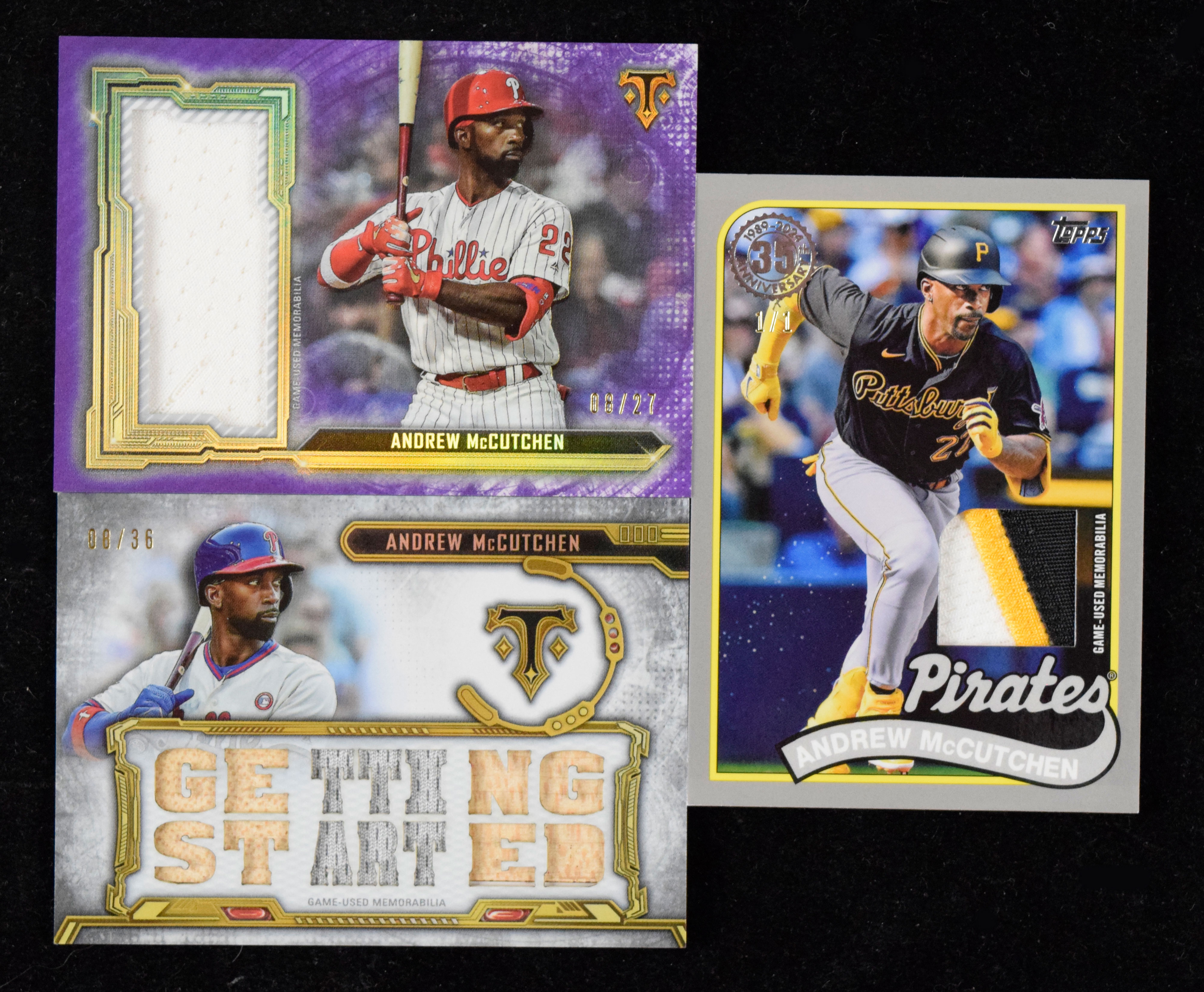 Lot of (3) Andrew McCutchen serial #ed game used relic swatch insert cards including 1/1 (NM-NM/MT). Includes 2020 Topps Triple Threads "Single Jumbo Relic Amethyst" #SJR-AM McCutchen (#ed 8/27), 2020 Topps Triple Threads "Triple Threads Relics" #TTR-MCC1 McCutchen (#ed 8/36), and 2024 Topps "1989 Topps Baseball 35th Anniversary Relics Platinum" #89BR-AM McCutchen (#ed 1/1): NM-NM/MT