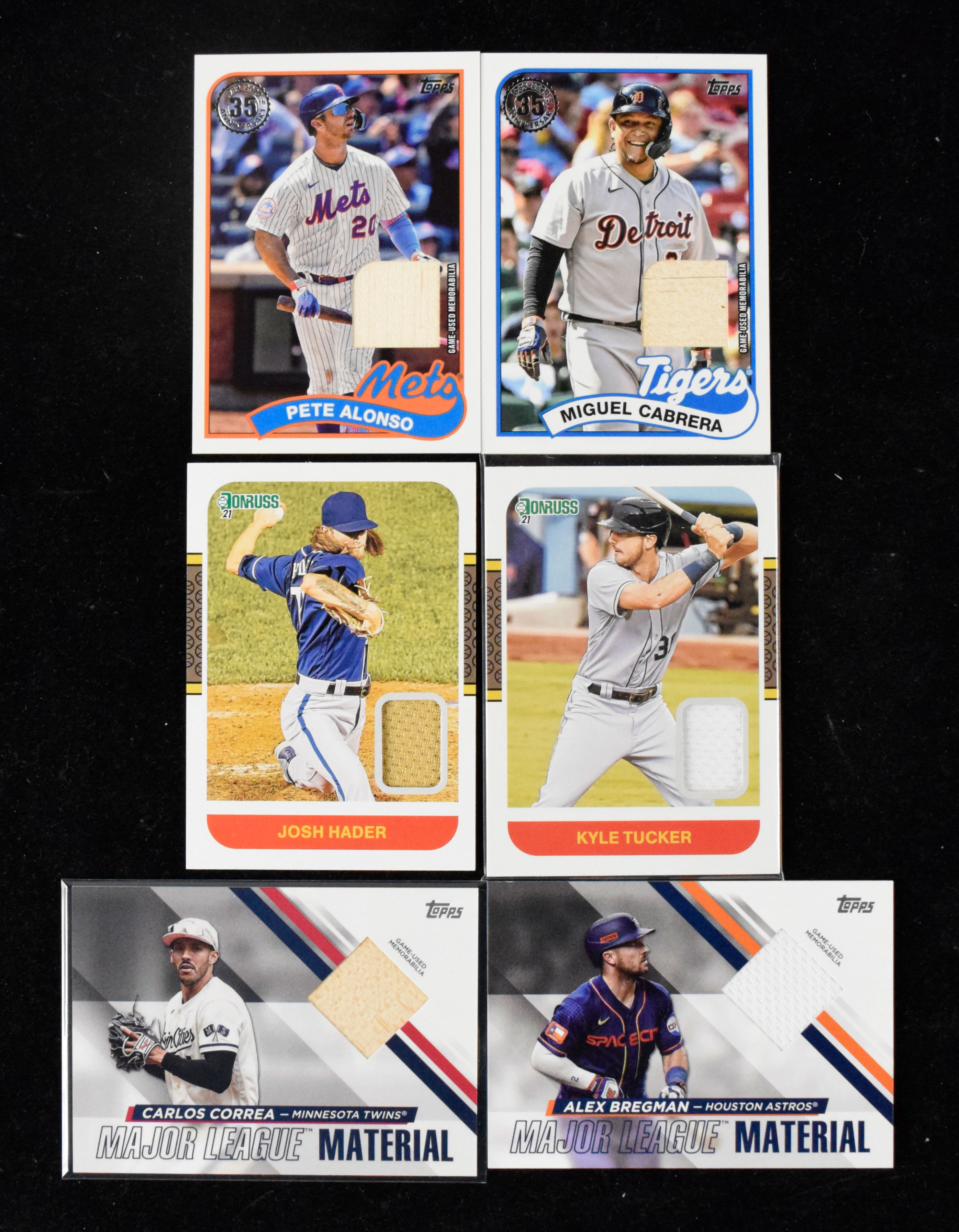 Lot of (15) baseball game used relic swatch insert cards (NM-NM/MT overall). Includes 2020 Panini Select "1993 Retro Select Materials" #93-RC Roger Clemens; 2020 Panini Chronicles "Spectra Silhouettes Relics" #42 Marcell Ozuna; 2021 Topps Museum Collection "Primary Pieces Quad Relics" #SPQR-NA Nolan Arenado; 2021 Donruss "Retro 1987 Materials" #s 87M-CK Clayton Kershaw, 87M-DM Don Mattingly, 87M-JH Josh Hader, 87M-JS Juan Soto, and 87M-KT Kyle Tucker; 2024 Topps "City Connect Swatch Collection Relics" #CC-CY Christian Yelich; 2024 Topps "1989 Topps Baseball 35th Anniversary Relics" #s 89BR-MC Miguel Cabrera, 89BR-PA Pete Alonso, and 89BR-RAJ Ronald Acuna Jr; 2024 Topps "Major League Material Relics" #s MLM-AB Alex Bregman, MLM-CC Carlos Correa, and MLM-JR Julo Rodroguez: NM-NM/MT overall