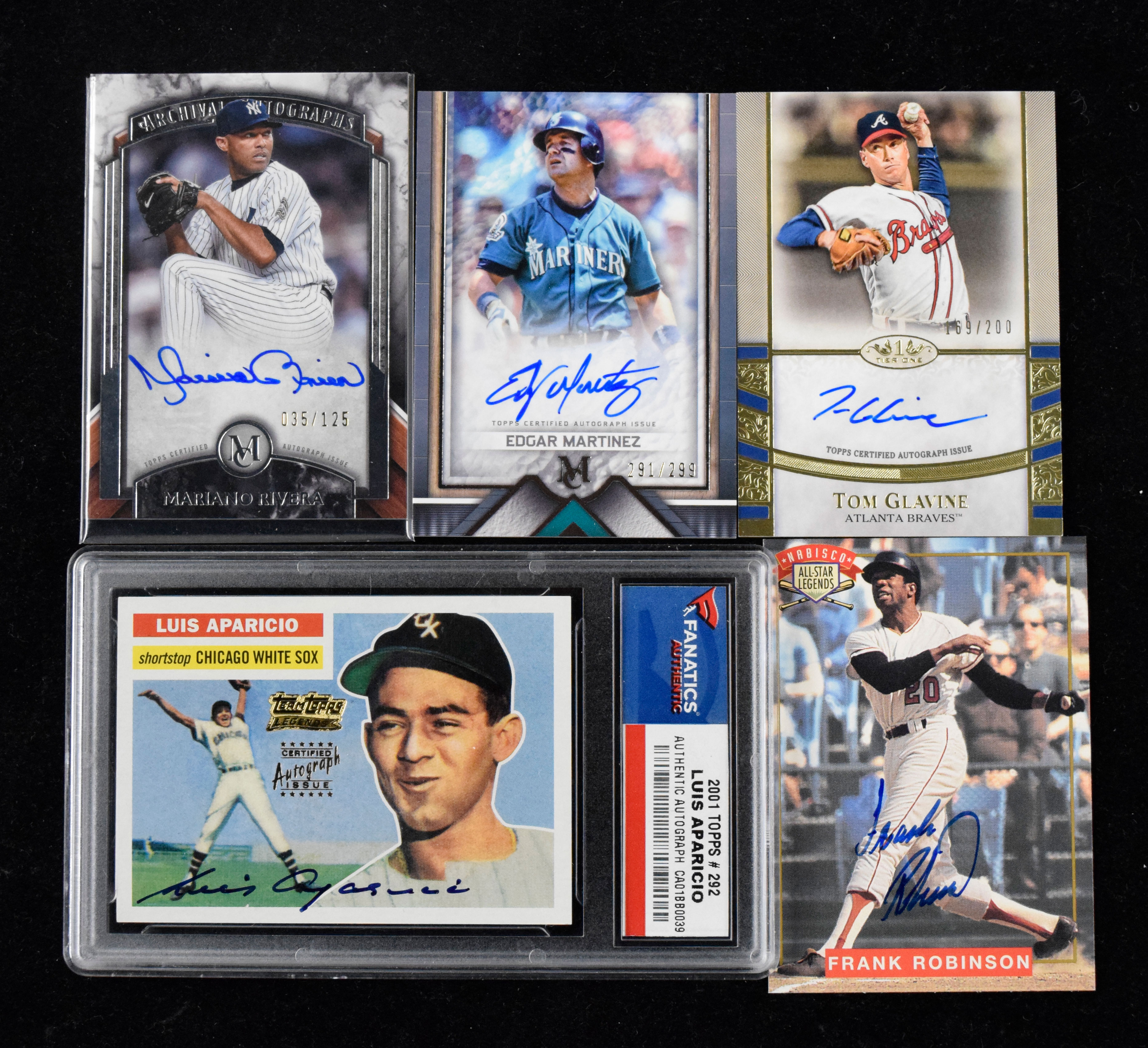 Description:Lot of (7) Baseball HOFers signed insert cards (NM-NM/MT). Includes (3) 1994 Nabisco "All-Star Legends Autographs" (Duke Snider, Frank Robinson, and Jim Palmer), 2002 Topps "Team Topps Legends Autographs" #TT-LA signed by Luis Aparicio, 2021 Topps Tier One "Autographs" #T1A-TG signed by Tom Glavine (#ed 169/200), 2022 Topps Museum Collection "Archival Autographs" #AA-MR signed by Mariano Rivera (#ed 35/125), and 2023 Topps Museum Collection "Archival Autographs" #AA-EM signed by Edgar Martinez (#ed 291/299). Signatures rate 8/9 to 10 out of 10: NM-NM/MT