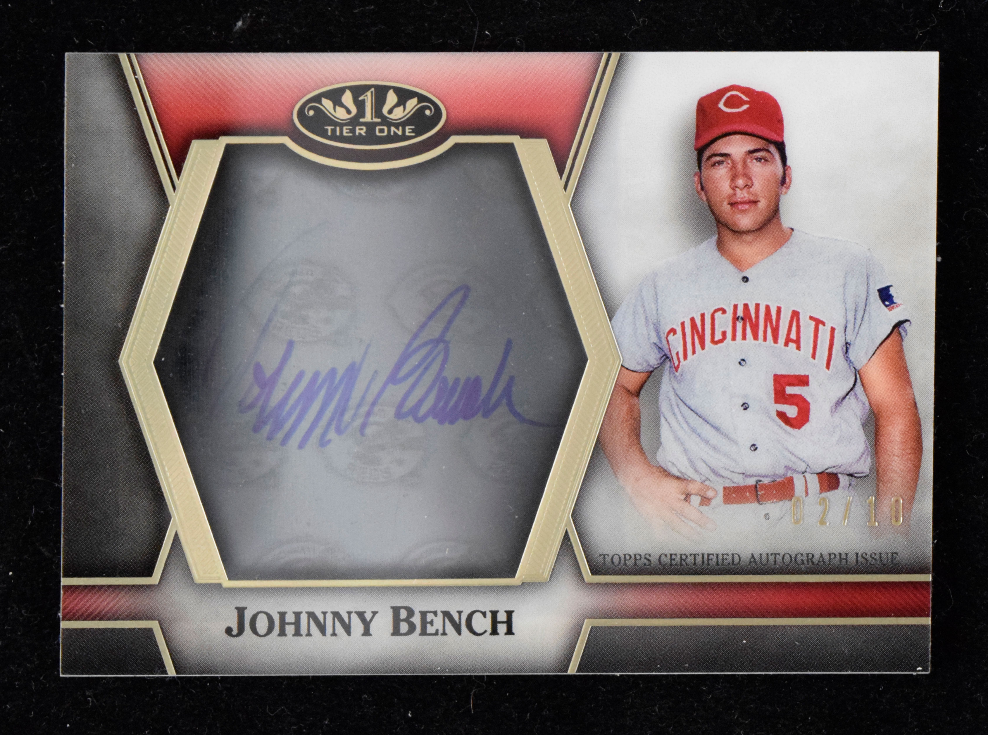 Description:Johnny Bench signed 2021 Topps Tier One insert card numbered 2/10 (NM). 2021 Topps Tier One "Clear One Autographs" #C1A-JBE signed by Bench in blue marker. Signature rates 8 out of 10. The card is #ed 2/10: NM