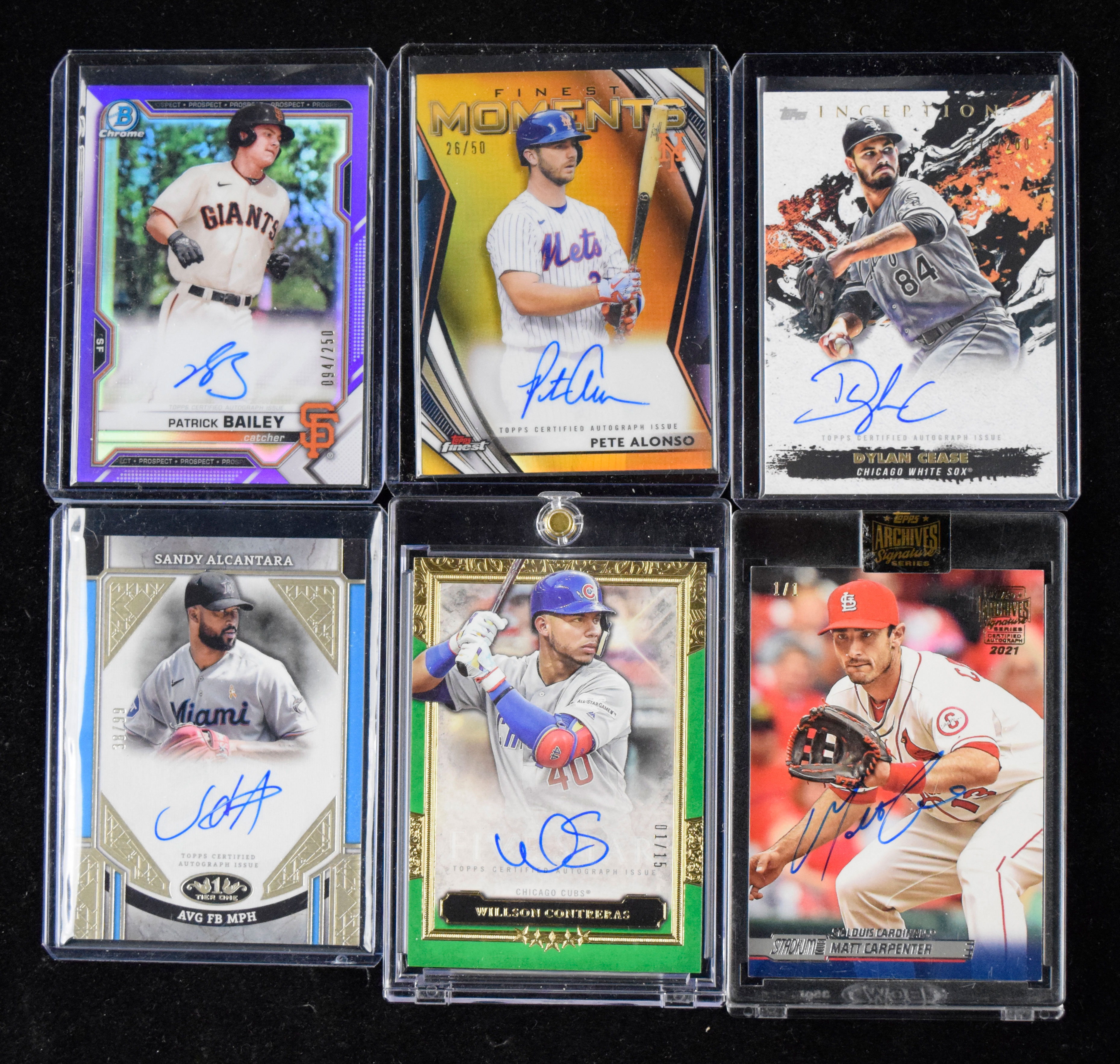 Description:Lot of (6) signed serial numbered baseball insert cards (NM-NM/MT). Includes 2020 Topps Five Star "Autographs Green" #FSA-WC signed by Willson Contreras (#ed 1/15), 2021 Topps Archives Signature Series "Active Player Edition" 2014 Stadium Club #73 signed by Matt Carpenter (#ed 1/1), 2021 Topps Finest "Finest Moments Autographs Gold Refractor" #FMA-PA signed by Pete Alonso (#ed 26/50), 2021 Topps Inception "Rookies & Emerging Stars Autographs" #RESA-DC signed by Dylan Cease (#ed 170/200), 2021 Bowman "Chrome Prospects Autographs Purple Refractors" #CPA-PB signed by Patrick Bailey (#ed 94/250), and 2024 Topps Tier One "Advanced Stats Stars Autographs" #ASA-SA signed by Sandy Alcantara (#ed 38/99). Signatures rate 8/9 to 10 out of 10: NM-NM/MT