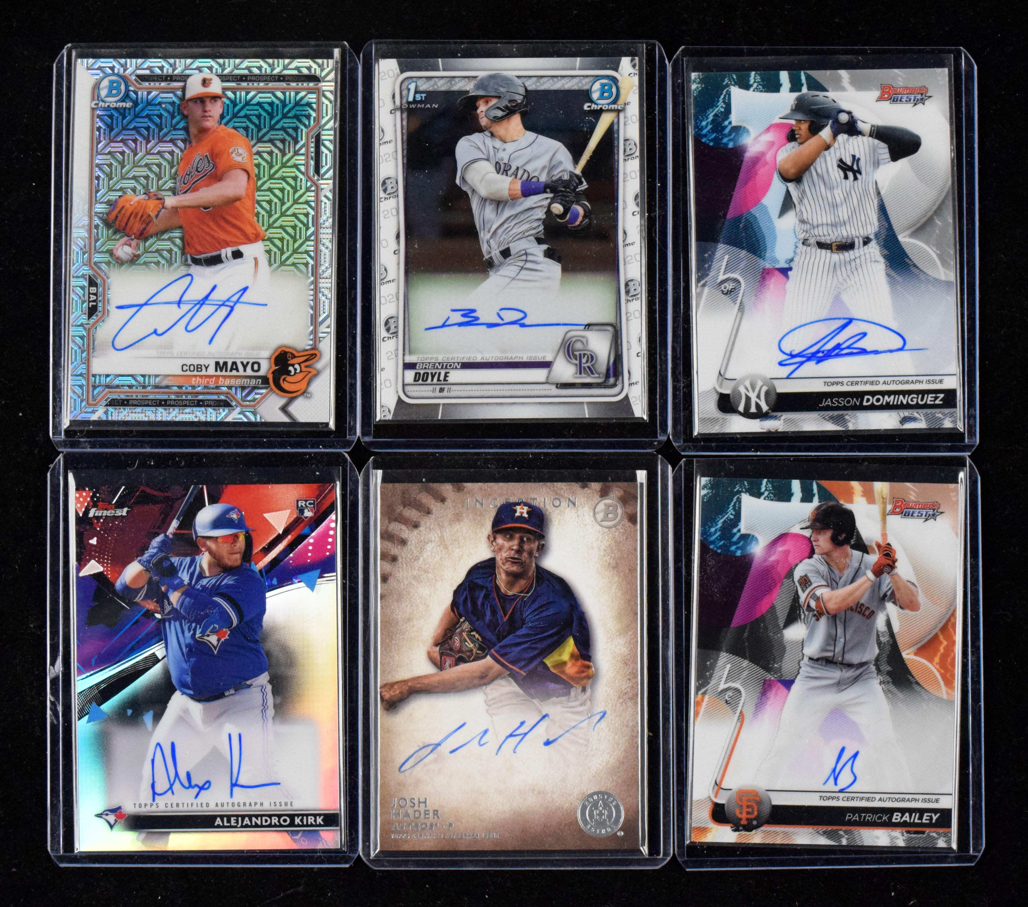Description:Lot of (12) signed modern baseball rookie cards (NM-NM/MT). Includes 2015 Bowman Inception "Prospect Autograph" #PA-JHA signed by Josh Hader; 2020 Bowman's Best "Best of 2020 Autographs" #s B20-JD signed by Jasson Dominguez, B20-NGO signed by Nolan Gorman, and B20-PB signed by Patrick Bailey; 2020 Bowman Chrome "Prospect Autographs" #CPA-BD signed by Brenton Doyle; 2020 Panini Contenders "Draft Pick Ticket" #DPT-NG signed by Nick Gonzales; 2020 Panini Prizm Draft Picks "Silver Prizm" #PDP177 signed by Heston Kjerstad; 2021 Topps Finest "Autographs" #s FA-AK signed by Alejandro Kirk, FA-KHA signed by Ke'Bryan Hayes, FA-RJ signed by Ryan Jeffers, and FA-RMA signed by Rafael Marchan; 2021 Bowman "Chrome Prospects Autographs Mojo Refractors" #BMA-CM signed by Coby Mayo. Signatures rate 8 to 10 out of 10: NM-NM/MT