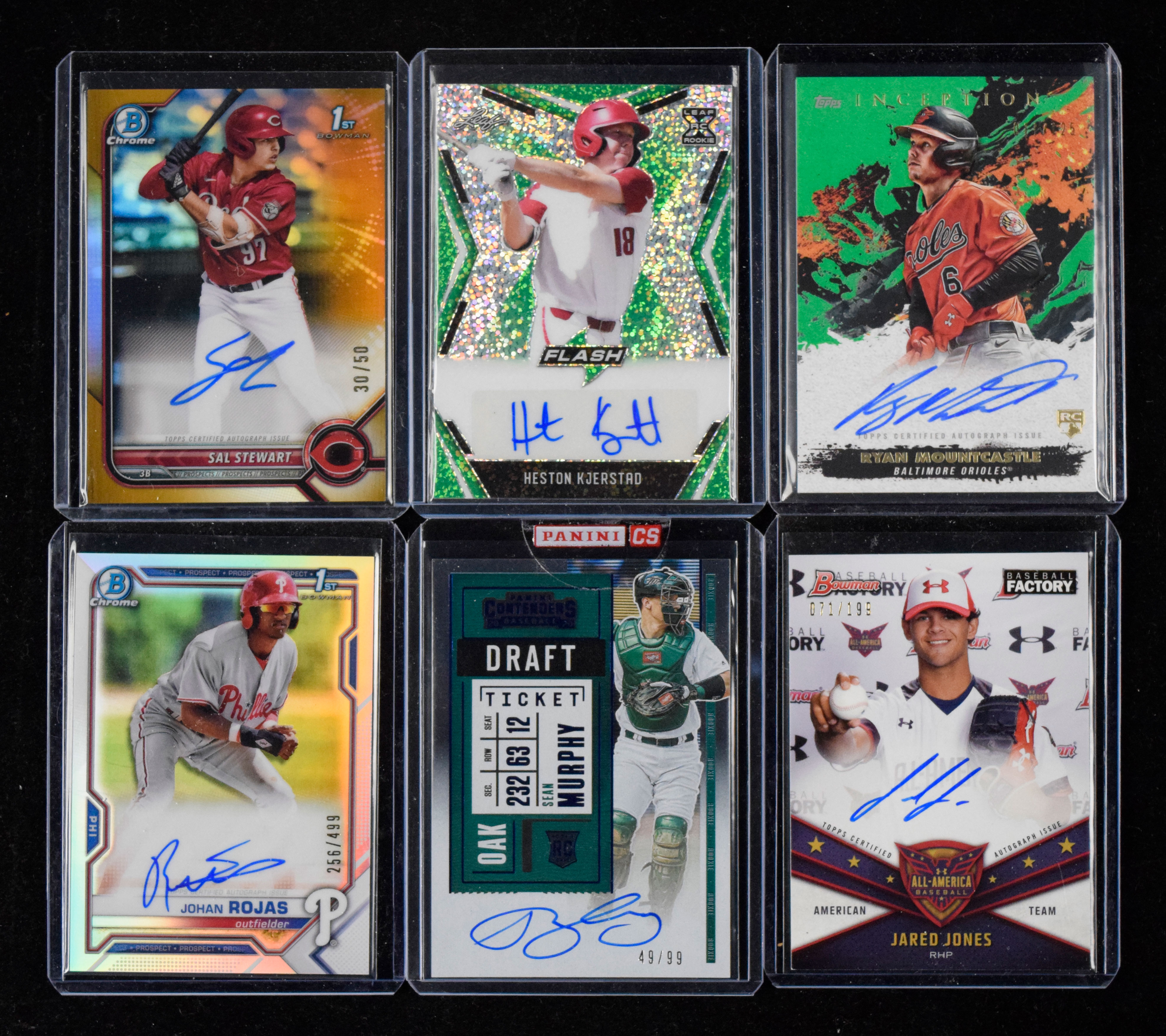 Description:Lot of (7) signed serial numbered baseball cards - mostly rookies (NM-NM/MT). Includes 2020 Topps Triple Threads "Rookies and Future Phenoms" #RFPAR-EJ triple relic card signed by Eloy Jimenez (#ed 83/99), 2020 Leaf Flash "Autographs Green" #BA-HK1 signed by Heston Kjerstad (#ed 15/25), 2020 Panini Contenders "Draft Ticket Blue" #116 signed by Sean Murphy (#ed 49/99), 2021 Topps Inception "Rookies & Emerging Stars Autographs Green" #RESA-RM signed by Ryan Mountcastle (#ed 11/125), 2021 Bowman "Chrome Prospects Autographs Refractors" #CPA-JR signed by Johan Rojas (#ed 256/499), 2021 Bowman "Under Armour All-America Game Autographs" #UAA-7 signed by Jared Jones (#ed 71/199), and 2022 Bowman Draft "Chrome Draft Pick Autographs Gold" #CDA-SS signed by Sal Stewart (#ed 30/50). Signatures rate 8/9 to 10 out of 10: NM-NM/MT