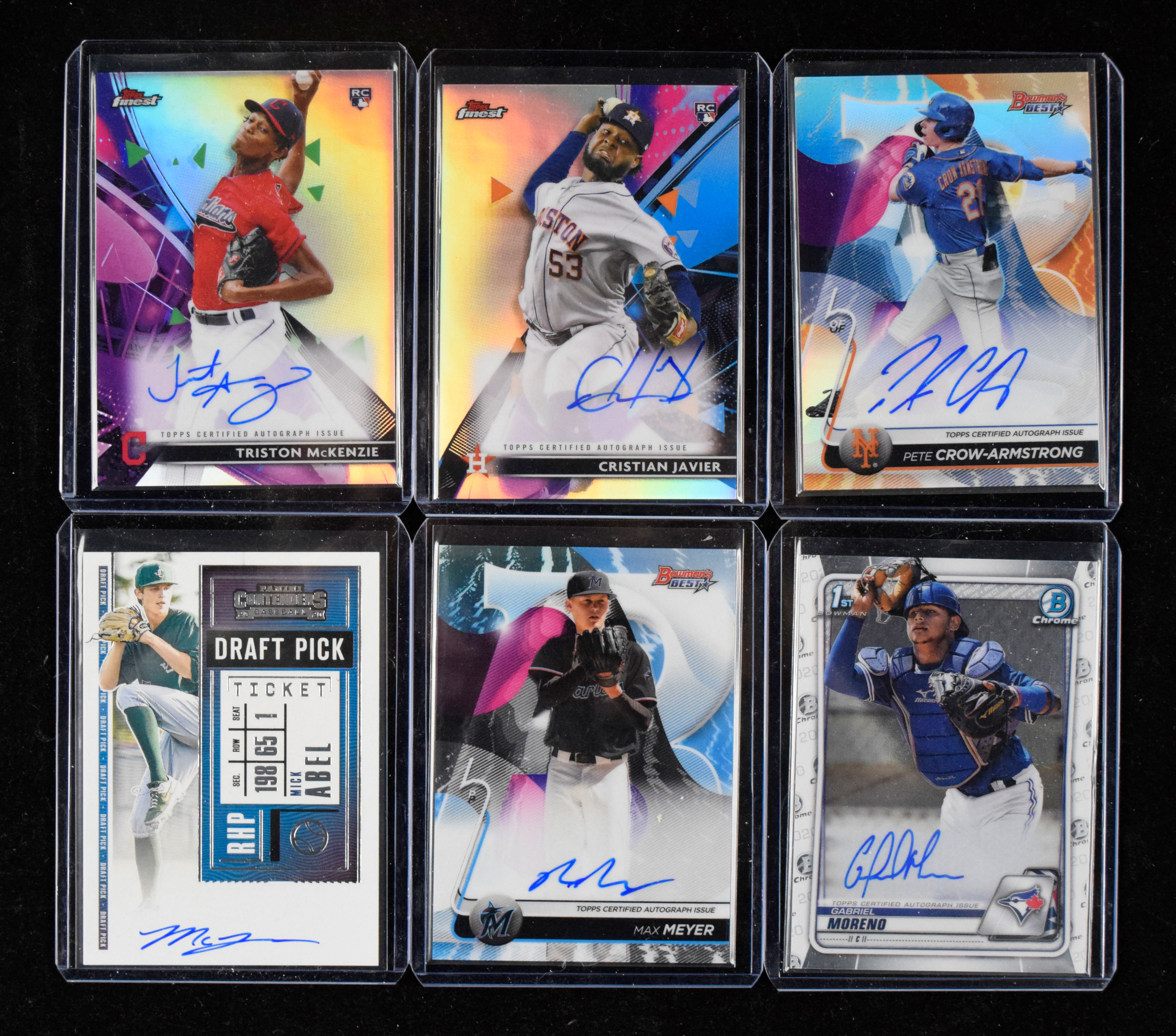 Description:Lot of (100) signed rookie and insert baseball cards (NM-NM/MT overall). Mainly from the early 2020s. Includes Mick Abel, Logan Allen, Jake Cousins, Gabriel Moreno, Keston Hiura, Pete Crow-Armstrong, Max Meyer, Mauricio Dubon, Emerson Hancock, Triston McKenzie, Odubel Herrera, Nick Maton, Cristian Javier, Taylor Walls, JoJo Romero, Michael King, Nick Madrigal, Leody Taveras, Dereck Rodriguez, Patrick Sandoval, Jonathan Singleton, Jose Urquidy, Mike Zunino, and many others. Signatures rate 8 to 10 out of 10: NM-NM/MT overall