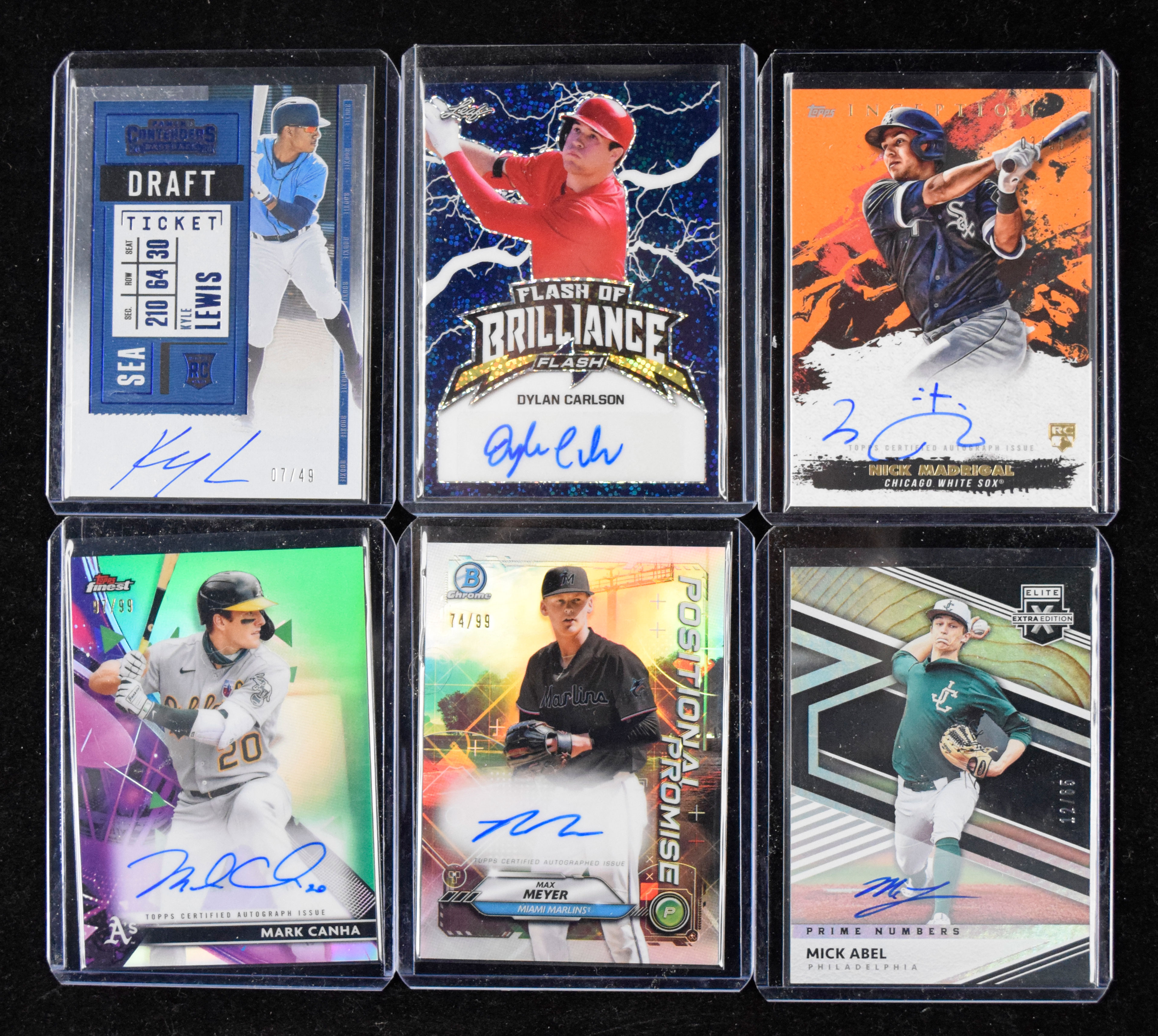 Description:Lot of (64) signed serial numbered baseball rookie and insert cards (NM-NM/MT overall). Mainly from the early 2020s, with all cards numbered from out of /49 to /100. Includes Kyle Lewis (7/49), Dylan Carlson (40/50), Mauricio Dubon (31/50), Brusdar Graterol (38/50), Nick Madrigal (3/50), Mike Yastrzemski (1/50), Mick Abel (12/65), Austin Meadows (2/74), Jose Urquidy (74/75), Mark Canha (97/99), Tony Cingrani (50/99), Bobby Dalbec (72/99), Cristian Javier (82/99), Max Meyer (74/99), Nick Senzel (44/99), Alex Kirilloff (67/100), and others. Signatures rate 8 to 10 out of 10: NM-NM/MT overall