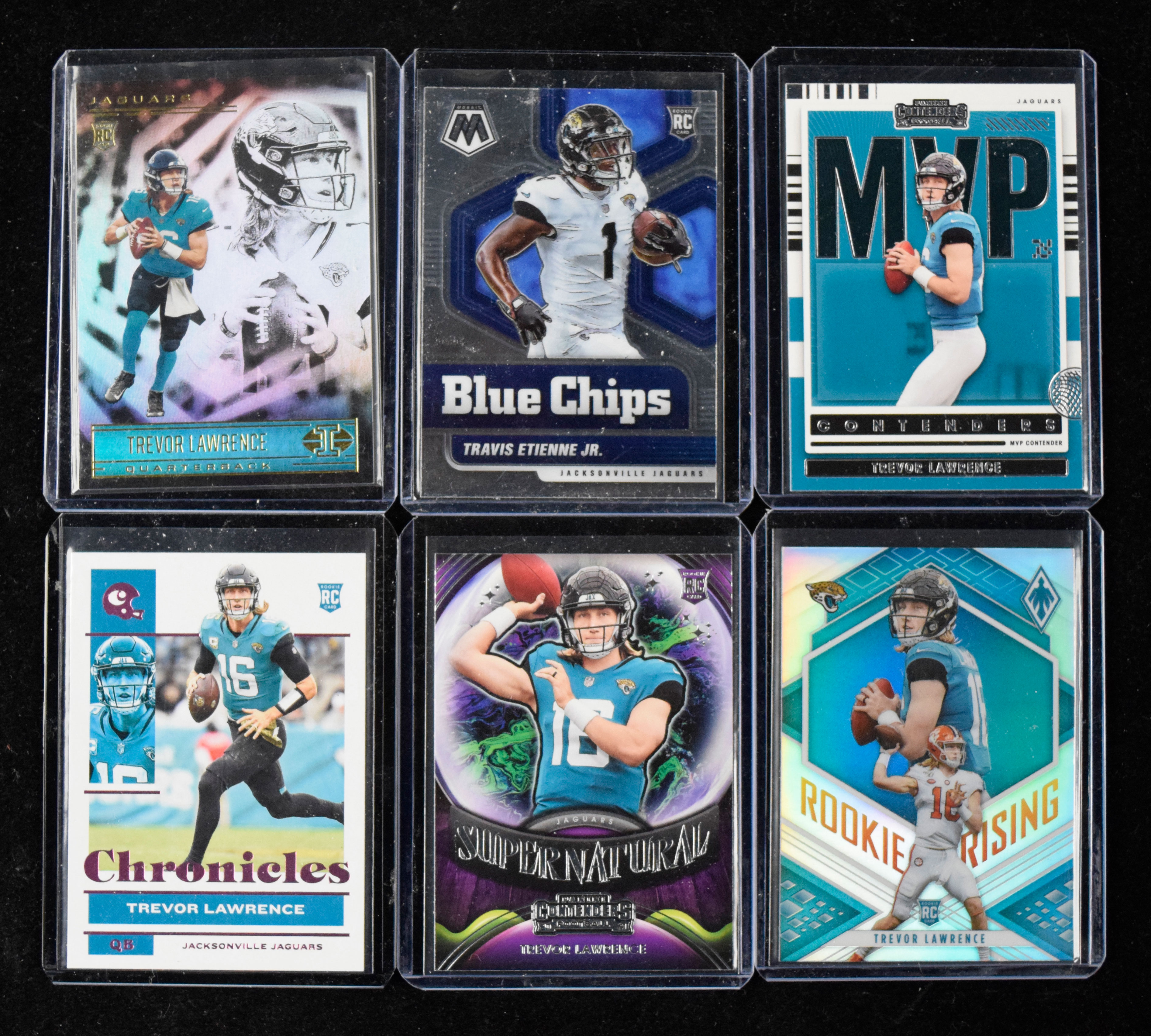 Lot of (15) Trevor Lawrence and Travis Etienne rookie cards (NM-NM/MT overall). Includes 2021 Panini Chronicles "Pink" #47 Lawrence, (2) 2021 Panini Contenders "MVP Contenders" #MVP-TLA Lawrence, 2021 Panini Contenders "Round 1 Numbers" #RN-TET Lawrence/Etienne, 2021 Panini Contenders "Supernatural" #SN-TLR Lawrence, (2) 2021 Panini Illusions #59 Lawrence, 2021 Panini Illusions "Mystique" #MY-1 Lawrence, 2021 Panini Mosaic #241 Lawrence, 2021 Panini Mosaic "Blue Chips" #s 1 Lawrence and (2) 13 Etienne, 2021 Panini Mosaic "Prizm" #314 Etienne, 2021 Panini Phoenix "Rookie Rising" #RIS-1 Lawrence, and 2021 Panini Playbook #101 Lawrence: NM-NM/MT overall