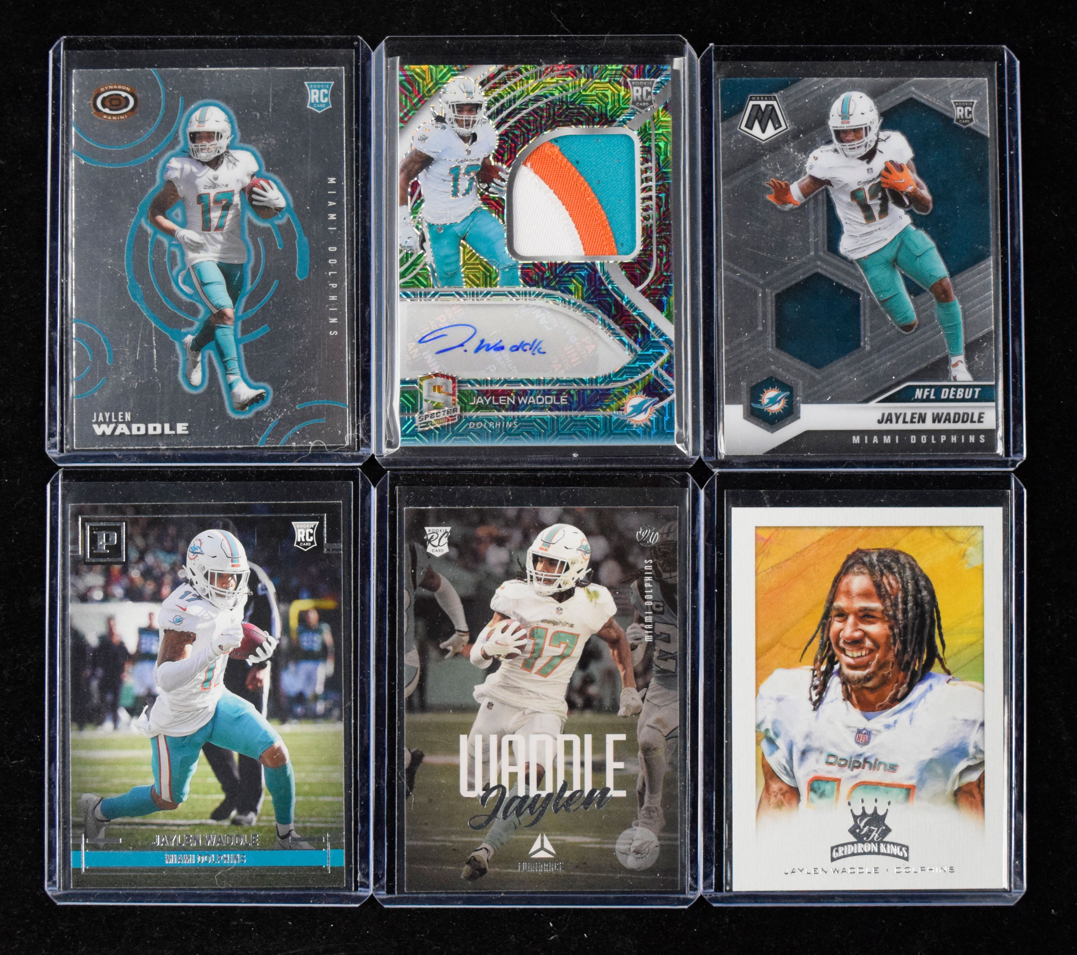 Lot of (11) Jayden Waddle rookie cards including #ed 2/10 rookie patch autograph card (NM-NM/MT). Includes 2021 Panini Chronicles #76 Waddle, 2021 Panini Chronicles "Dynagon Rookies" #D-10 Waddle, 2021 Panini Chronicles "Gridiron Kings" #GK-26 Waddle, 2021 Panini Chronicles "Luminance Update Rookies" #213 Waddle, 2021 Panini Chronicles "Panini Football" #PA-26 Waddle, 2021 Panini Chronicles "Prizm Black" #PB-10 Waddle, 2021 Panini Chronicles "Score Update Rookies" #413 Waddle, 2021 Panini Illusions "Illusionists" #ILL-20 Waddle, (2) 2021 Panini Mosaic #248 Waddle, and 2021 Panini Spectra "Rookie Patch Autographs Meta" #212 signed by Waddle (#ed 2/10): NM-NM/MT